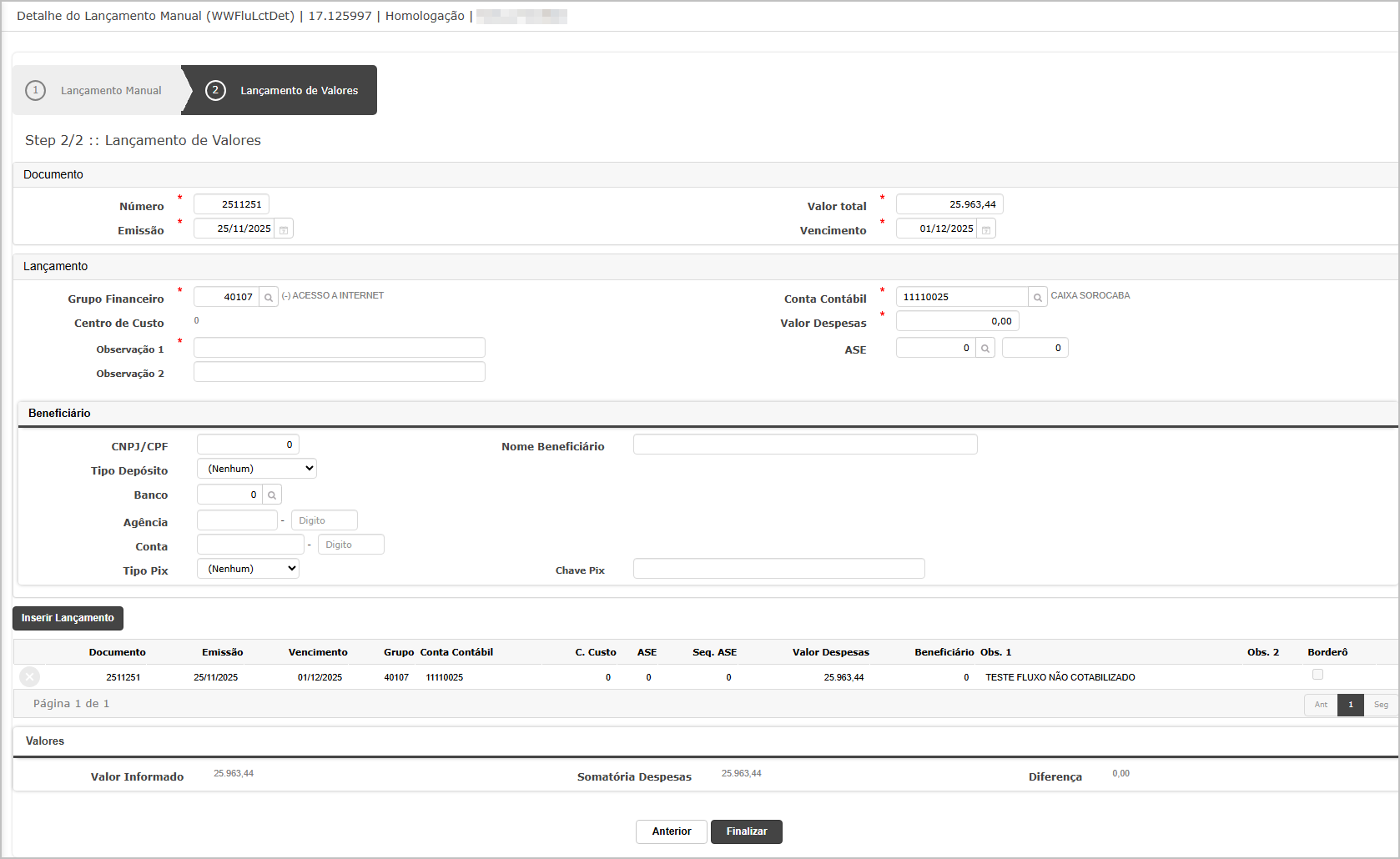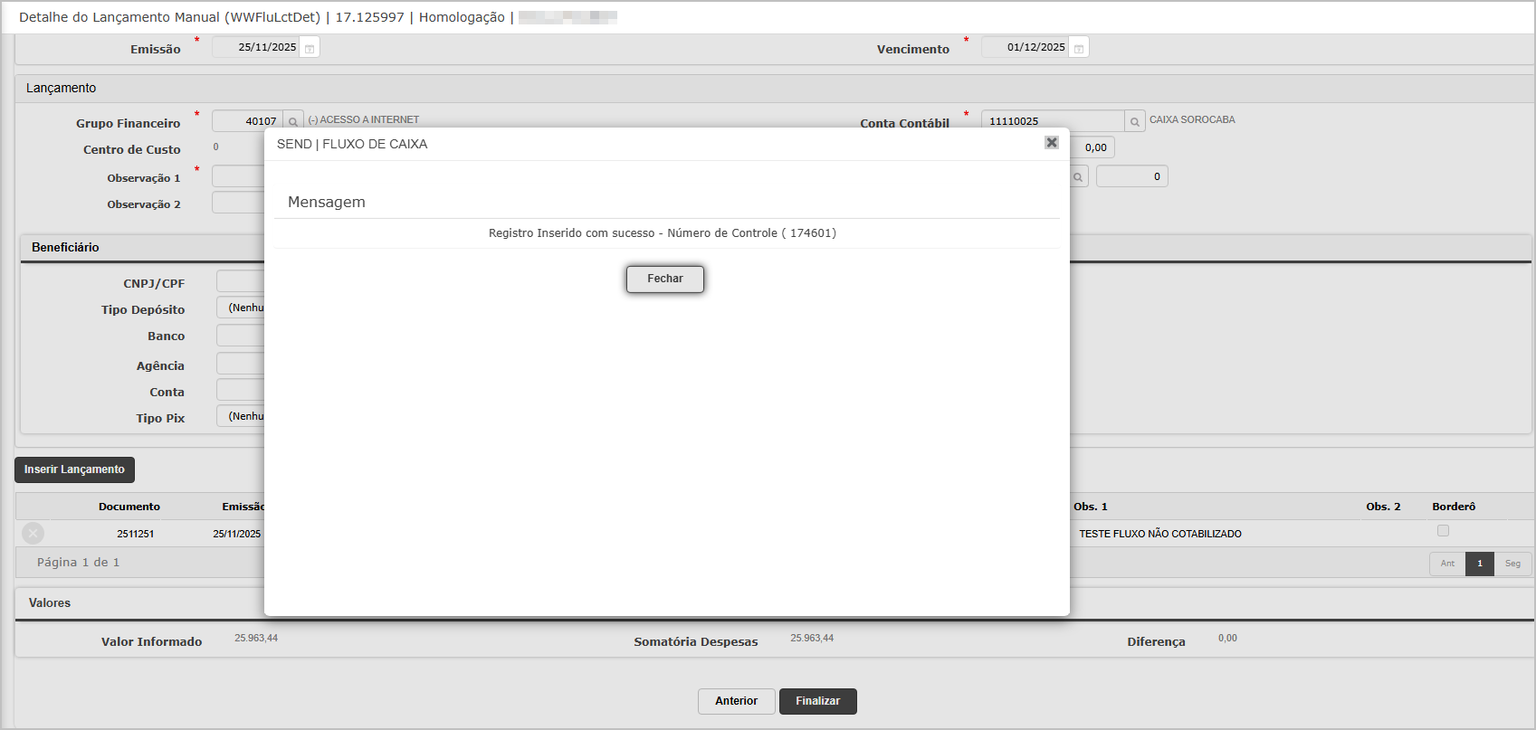 Após inserir todas as informações do lançamento, clique em Inserir Lançamento e posteriormente clique em Finalizar.