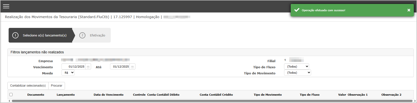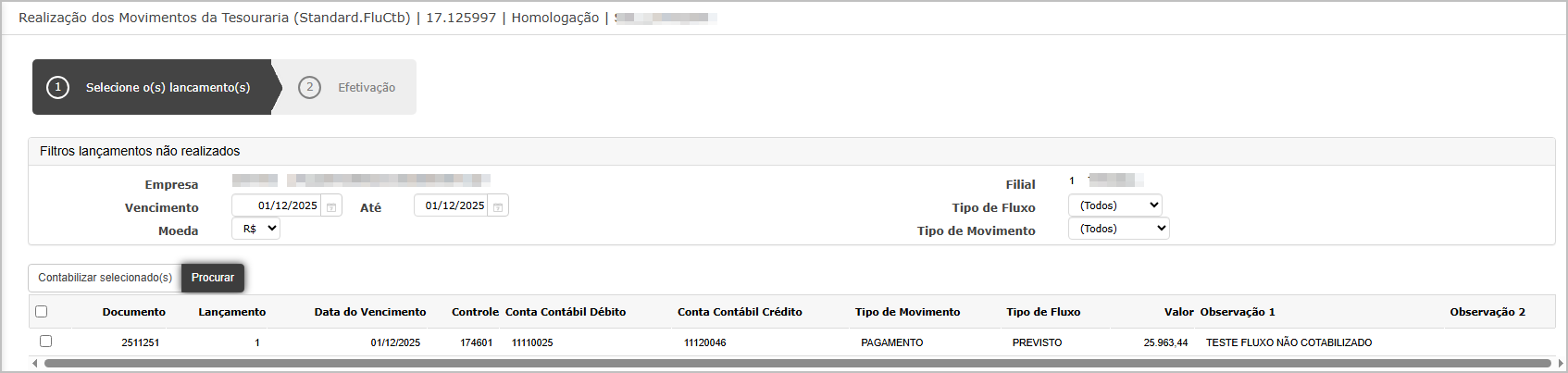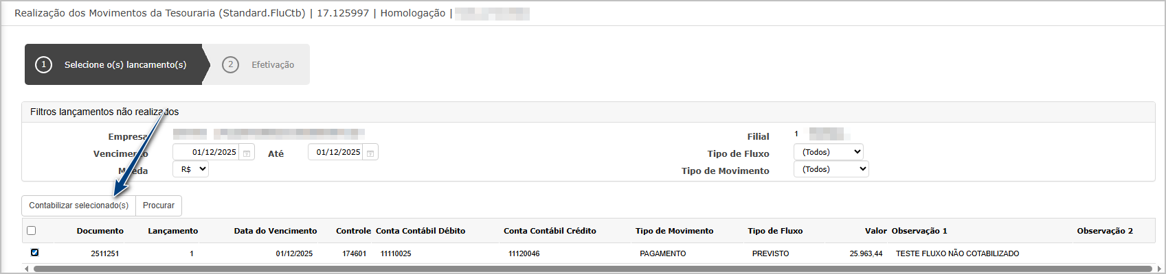 Na tela de realização, encontre o lançamento feito no passo anterior, marque e clique em contabilizar selecionado.