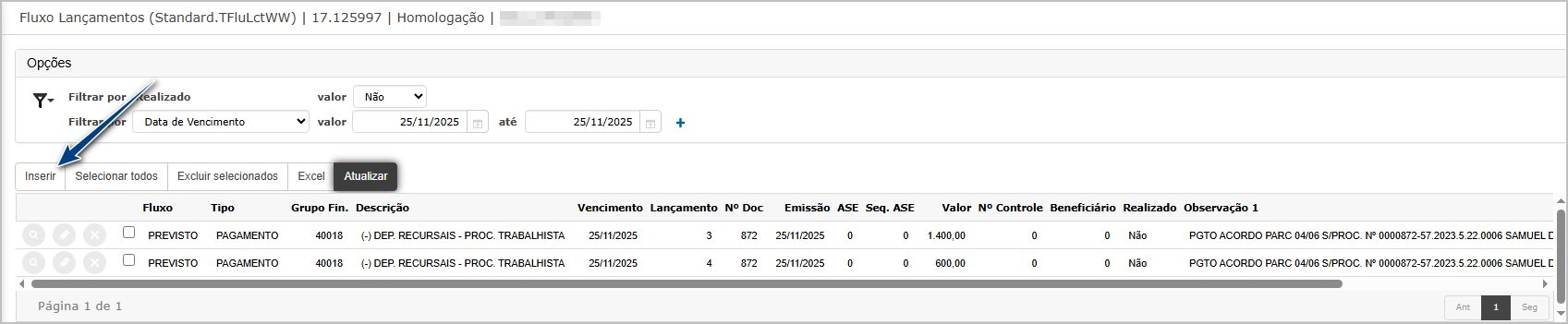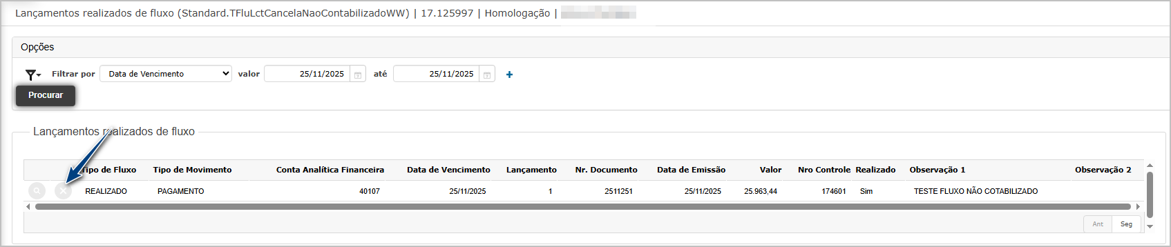 Na tela de cancelamento, encontre o lançamento do passo anterior e clique em cancelar.