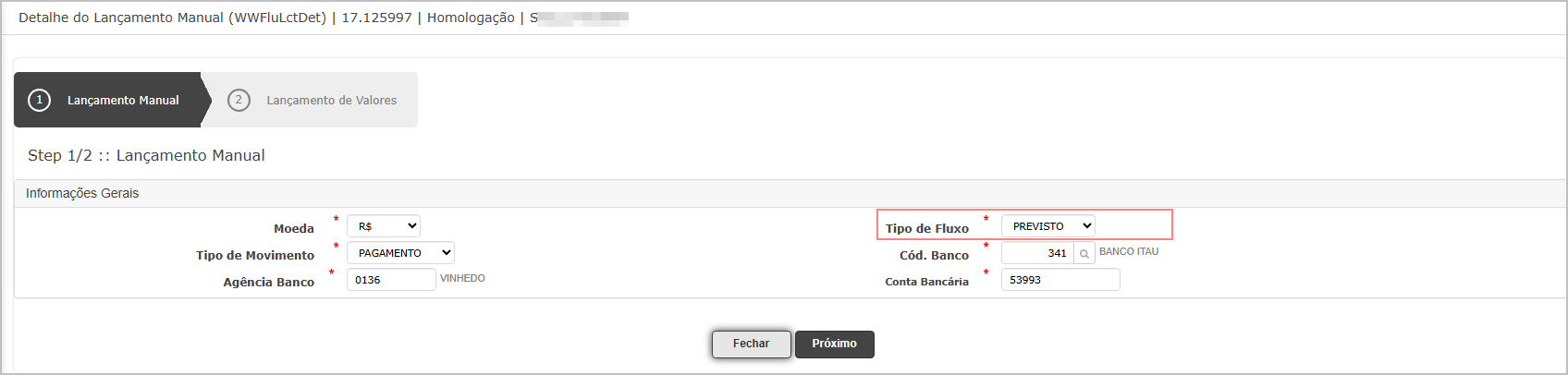 Ao abrir a tela de lançamento manual, insira as informações (neste exemplo utilizaremos o tipo de fluxo Previsto) e clique em Próximo.