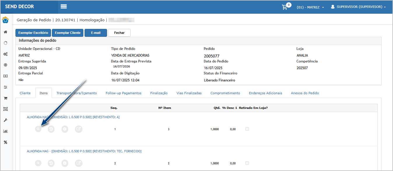 Acessar Frente de Loja → Pedidos → Pedidos de Venda → Guia Itens → Consultar Itens.