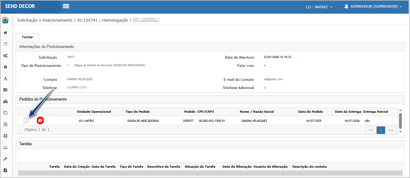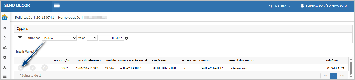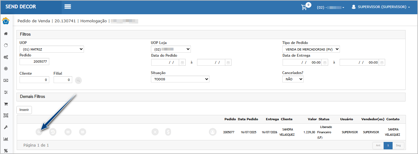 Na tela principal, encontre o pedido com ordem de compra e clique no botão de consulta.
