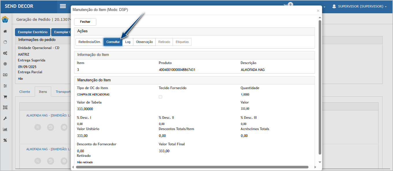Ao abrir os detalhes do item, clique no botão Consultar.