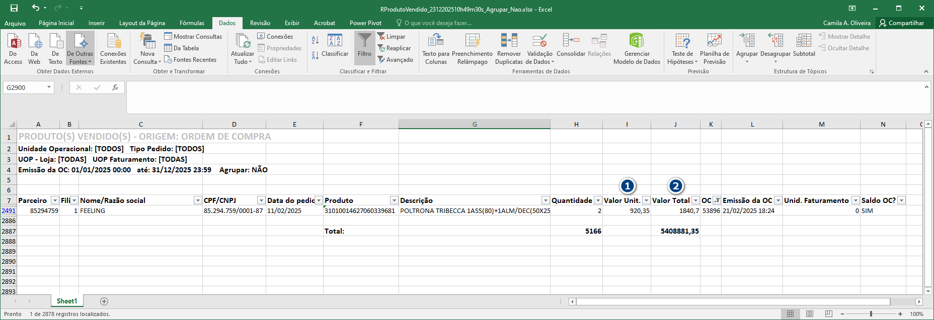 No relatórios em Excel são exibidos Valor Unitário (1) Valor Total (2).