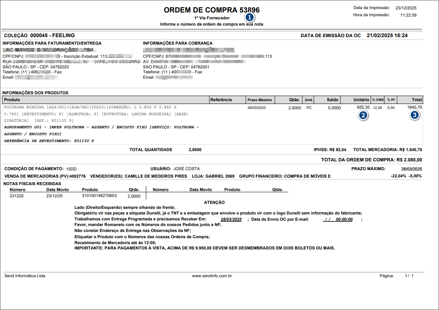 Na consulta da OC (1) são exibidos Valor Unitário (2) Valor Total (3).