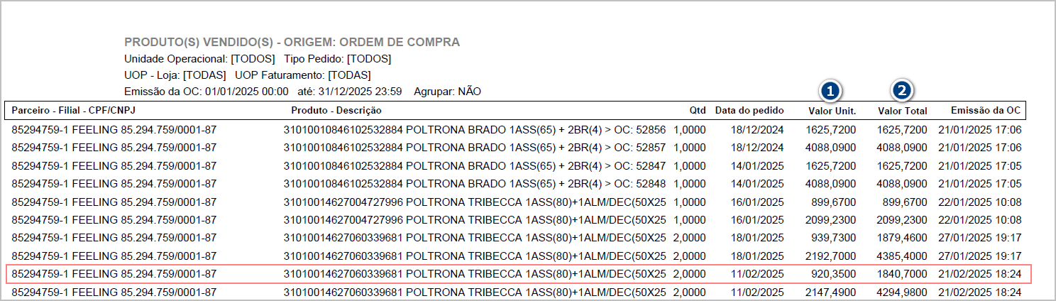 No relatórios em PDF são exibidos Valor Unitário (1) Valor Total (2).