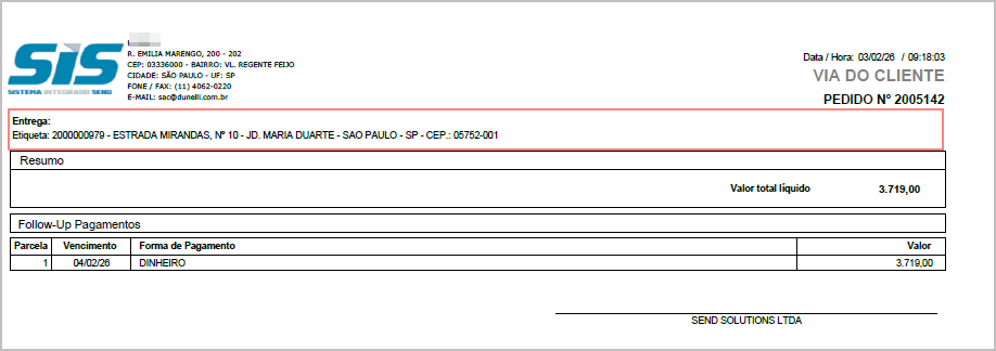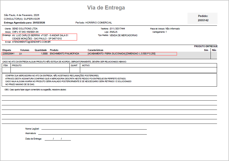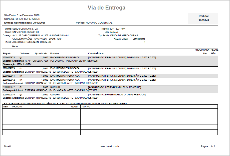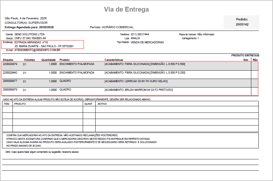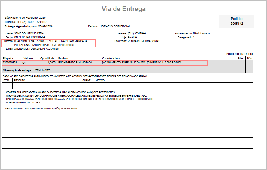 Note que na via do cliente são exibidas os dados do endereço adicionais. Para o item que não tem endereço adicional, será utilizado o endereço do pedido.