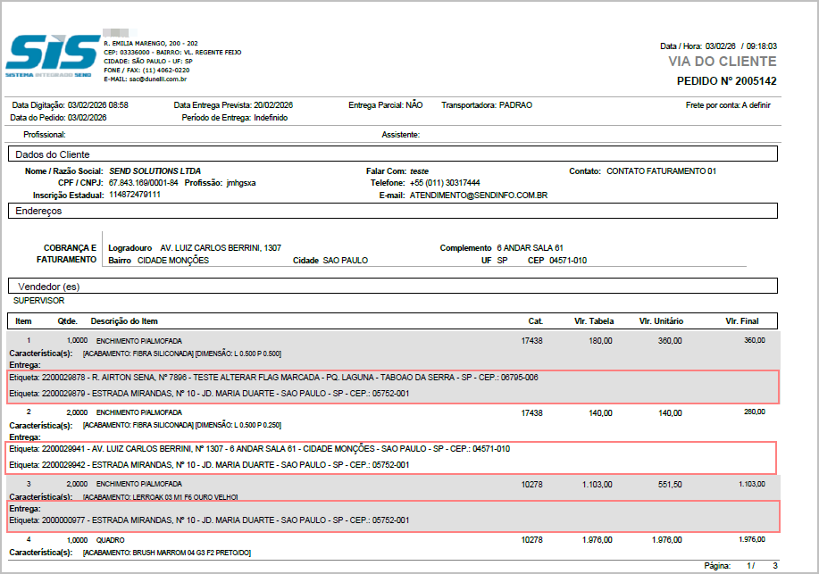 Além disso, melhorar a via de entrega do pedido para deixar bem visível, qual é o endereço principal do pedido, e qual é o endereço de entrega de cada item quando houver endereços diferentes, reduzindo a confusão do entregador (principalmente quando o documento exibe o endereço principal no cabeçalho e os itens com endereços divergentes).