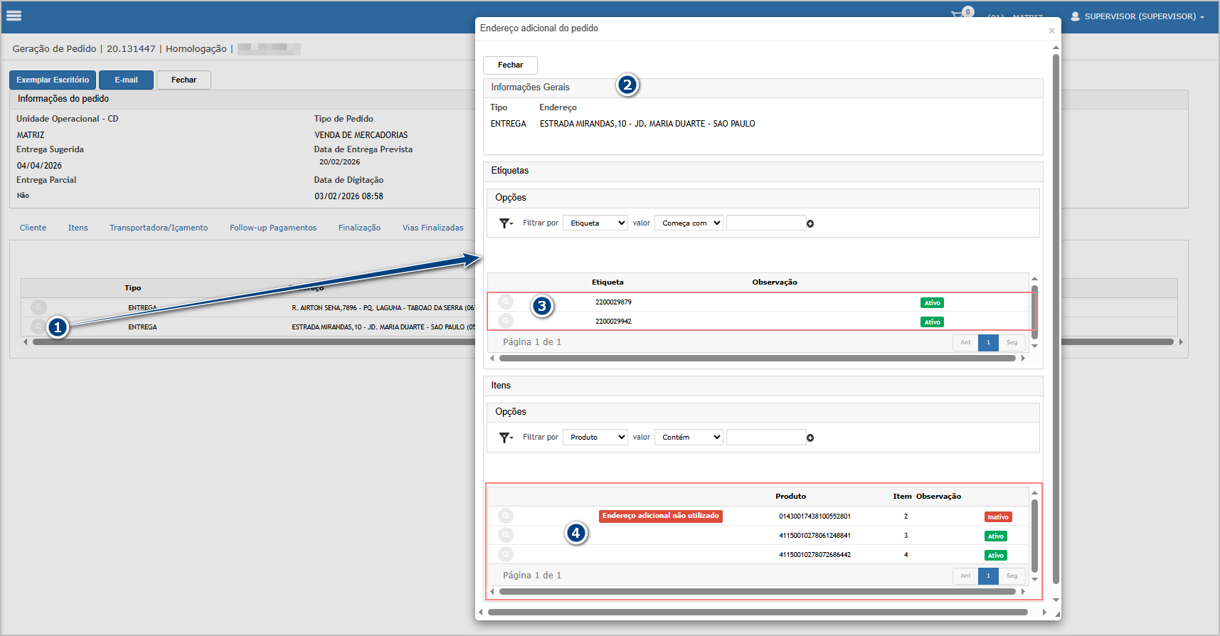 Na aba endereço adicionais, consulte o endereço adicional (1), nos detalhes (2) serão exibidas as etiquetas/itens atrelados ao endereço (3).