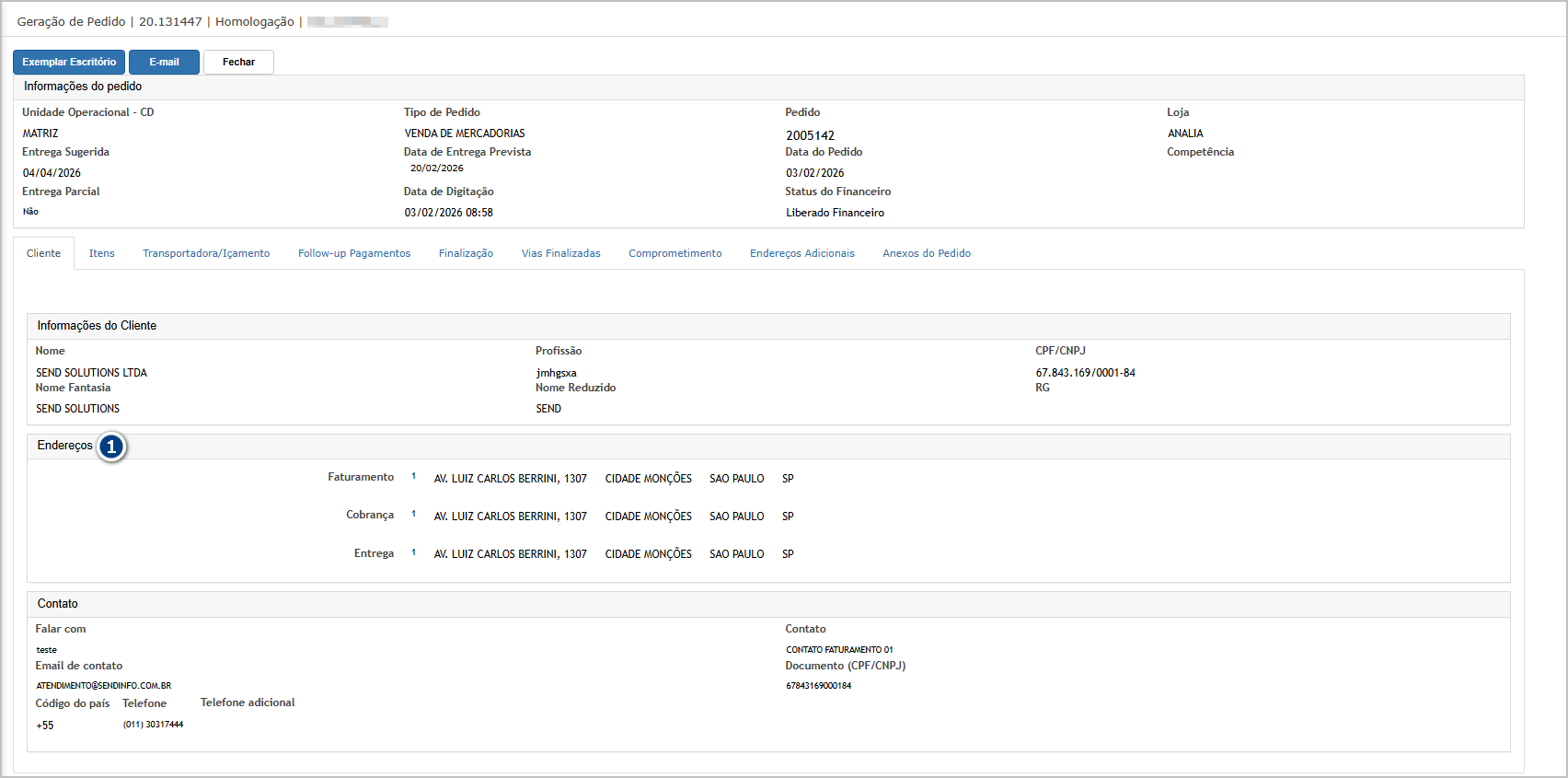 Criar/abrir um pedido para um cliente com endereços adicionais cadastrados.