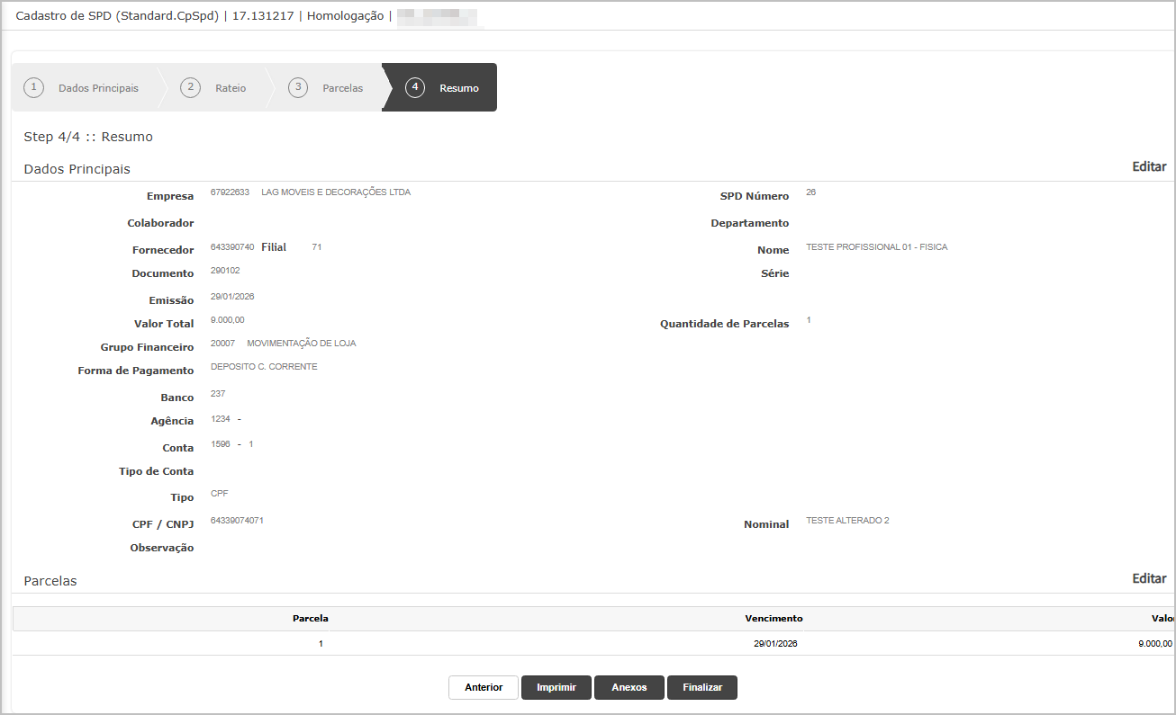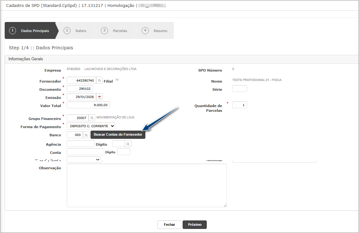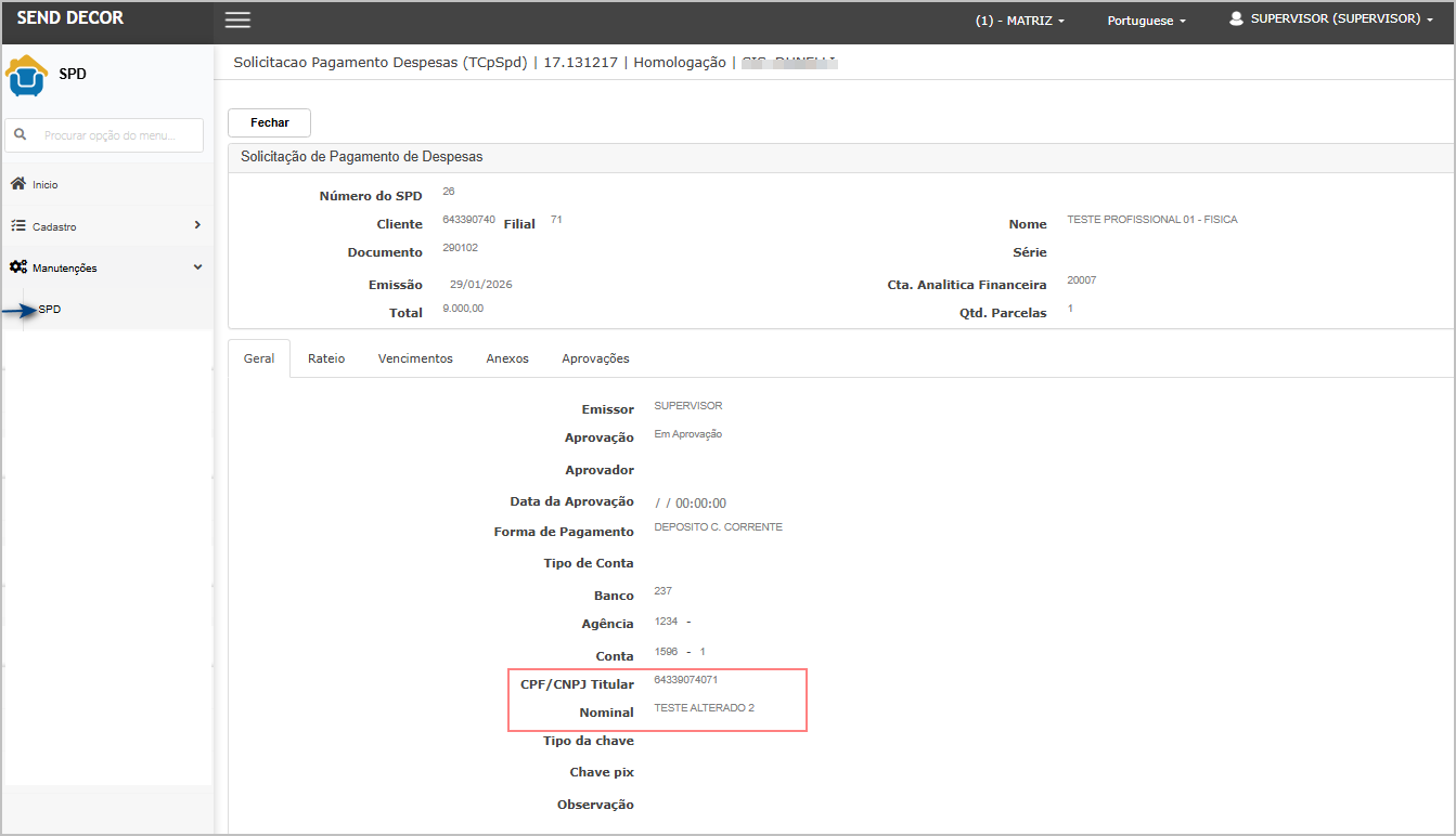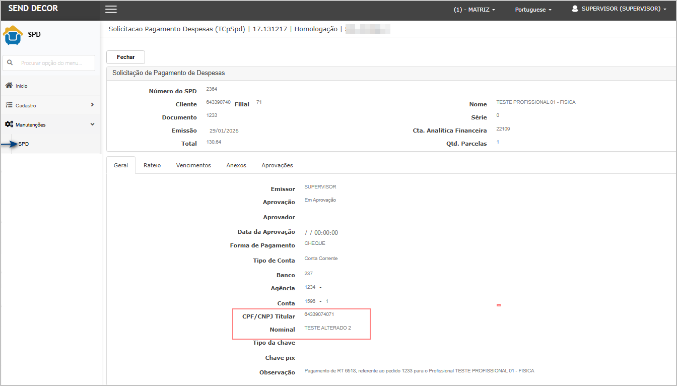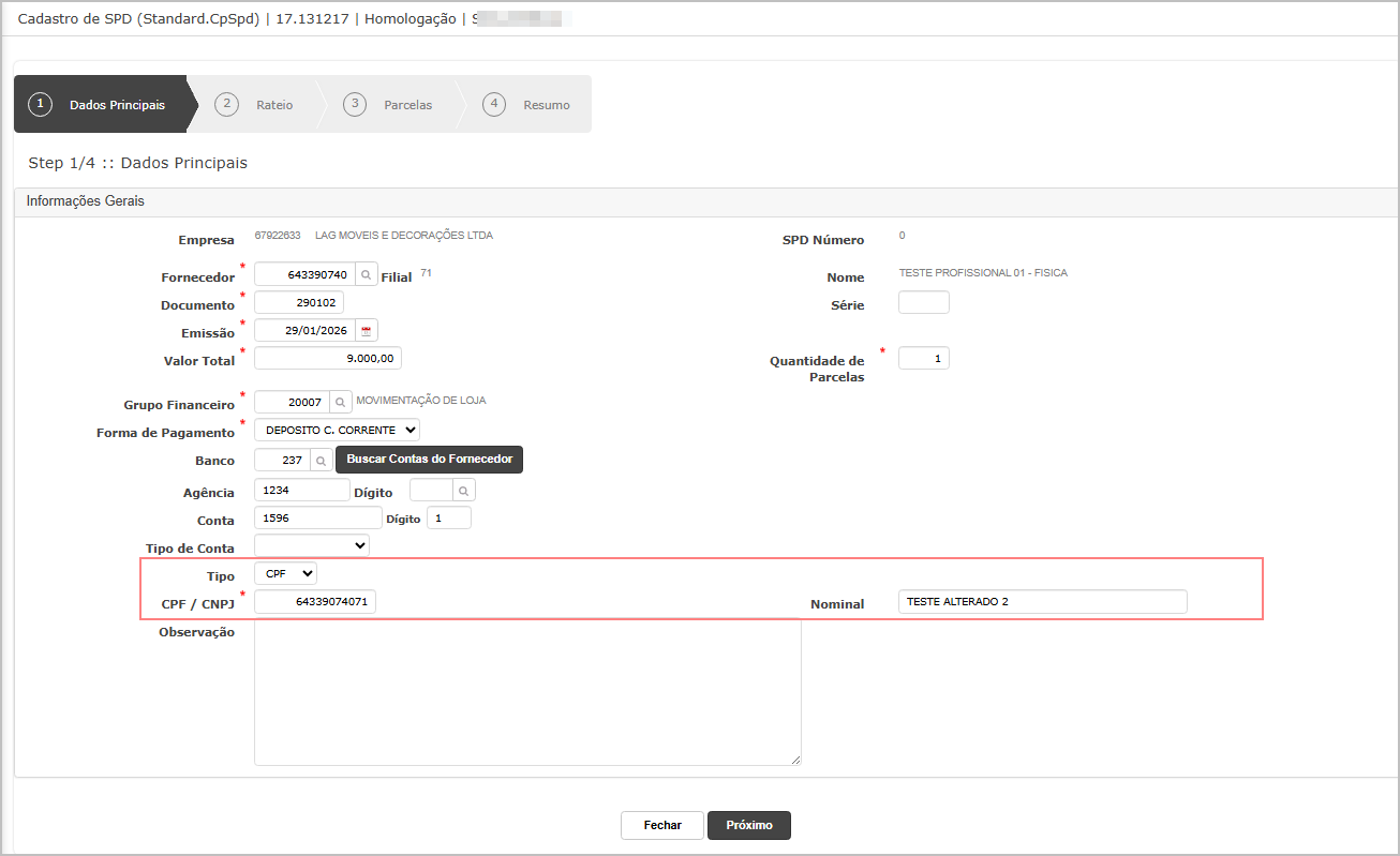Cenário 4: SPD: ao carregar a conta bancária do fornecedor, preencher CPF/CNPJ automaticamente