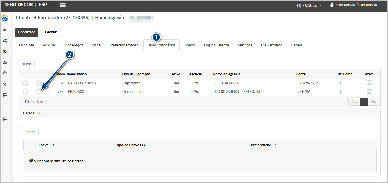 Ao entrar na tela de cadastro de parceiro, vá na aba Dados Bancários (1) e depois em editar (2) o banco desejado.