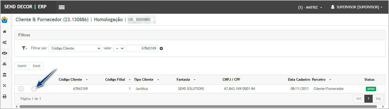 Localizar um cliente/fornecedor (ou inserir um novo) e abrir para edição.