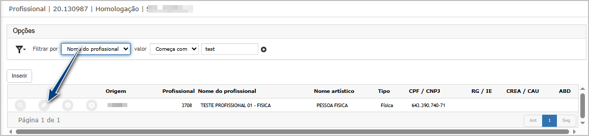 Selecionar um profissional existente para edição ou clicar em Incluir para novo cadastro.