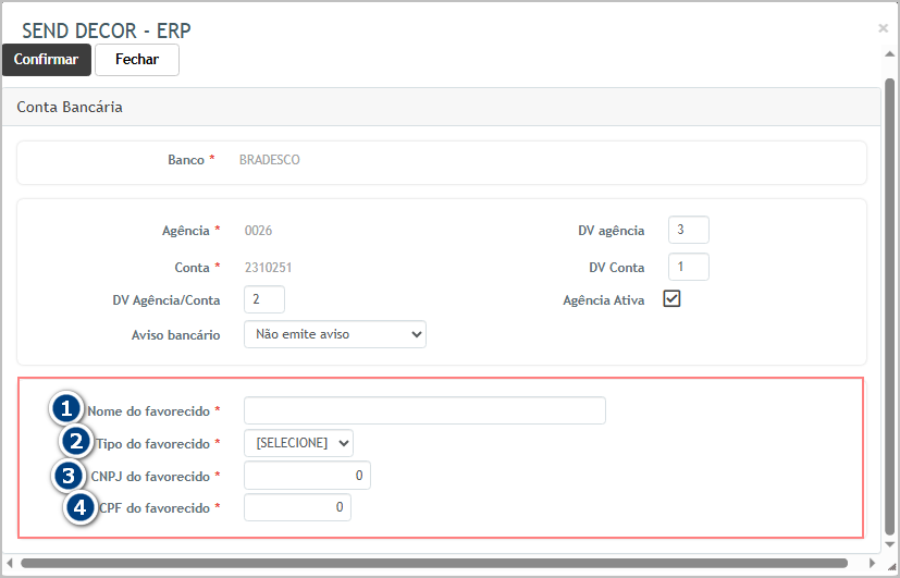 Os dados do favorecido devem ser carregadas conforme cadastro.