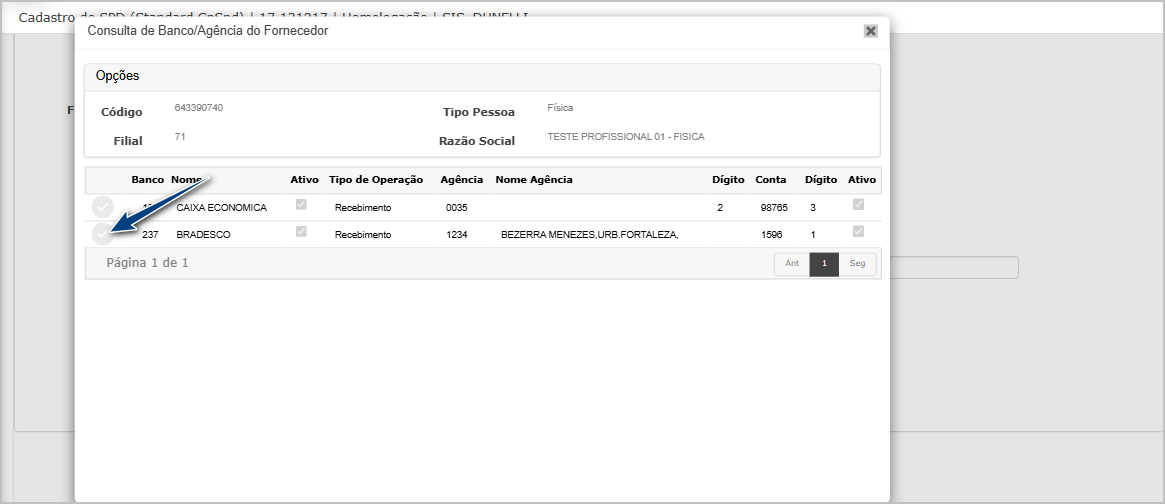 Selecionar o Fornecedor que possui a conta bancária com CPF/CNPJ do favorecido preenchido (cenários 02/03).