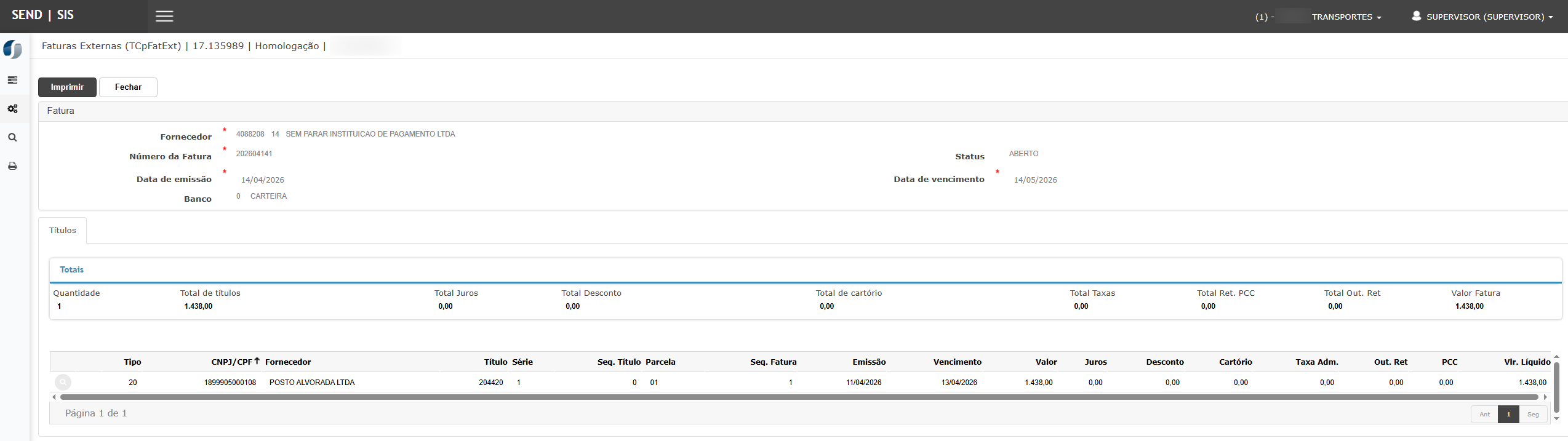 - Devem ser exibidos os dados do fornecedor, número da fatura, data de emissão, data de vencimento, banco e status.
