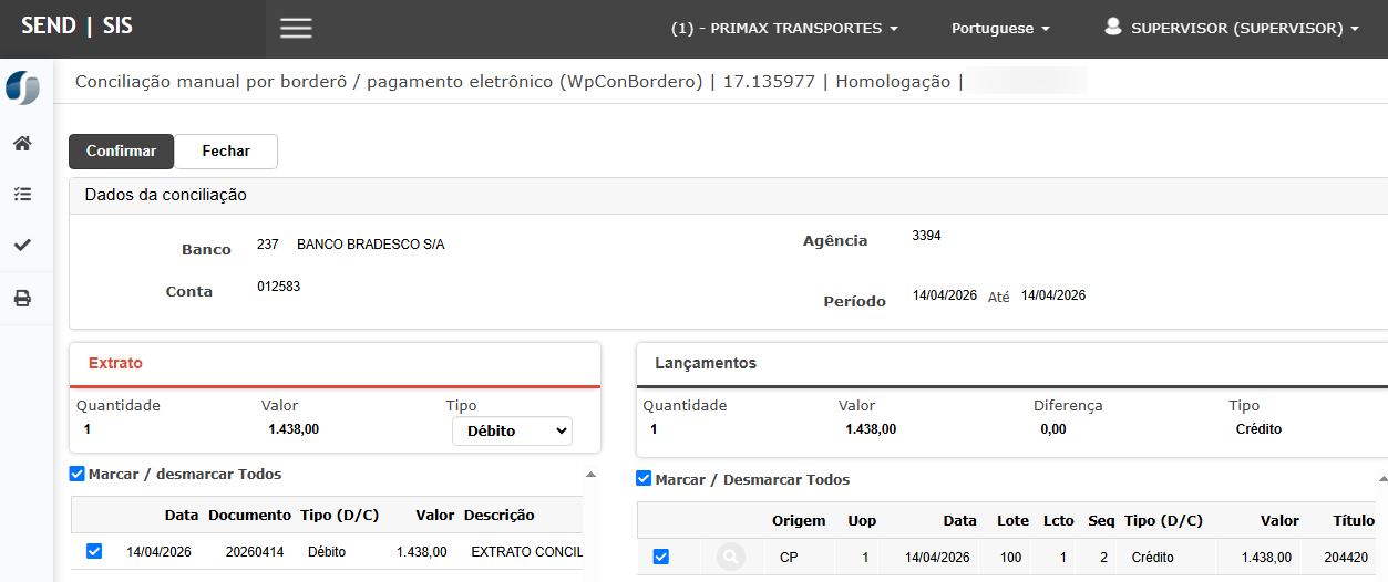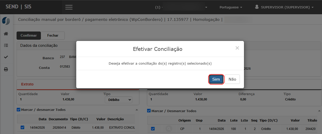- Após confirmar, a mensagem de sucesso da conciliação deve ser exibida.