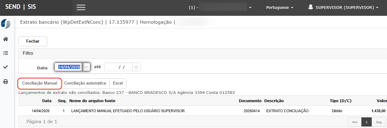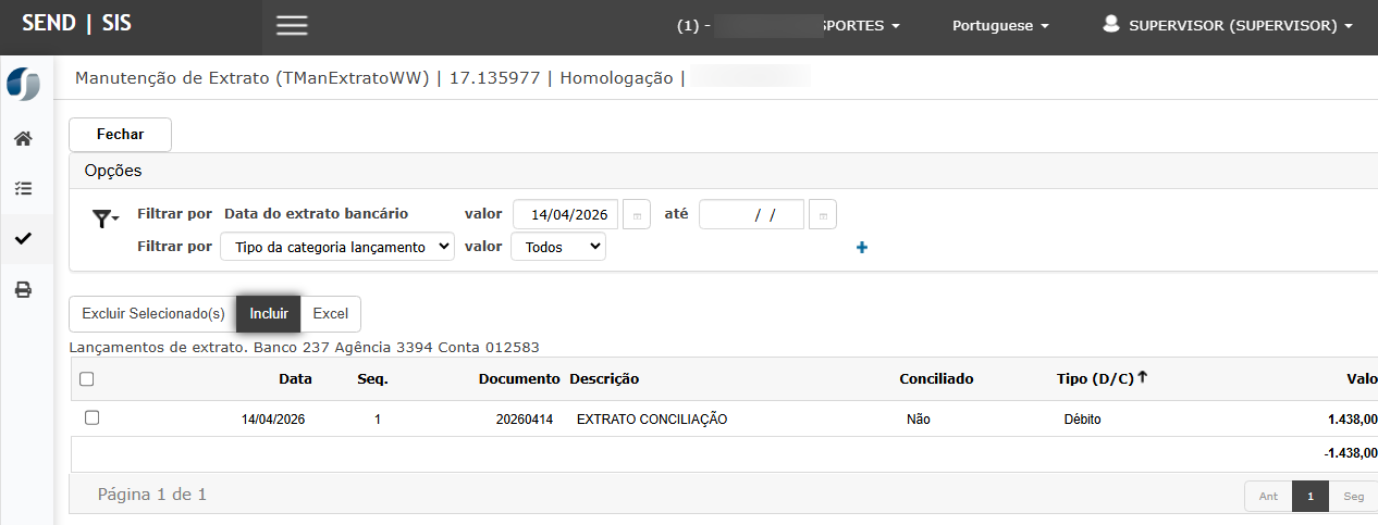 CENÁRIO 16 - Incluir manualmente o extrato bancário para simulação da conciliação