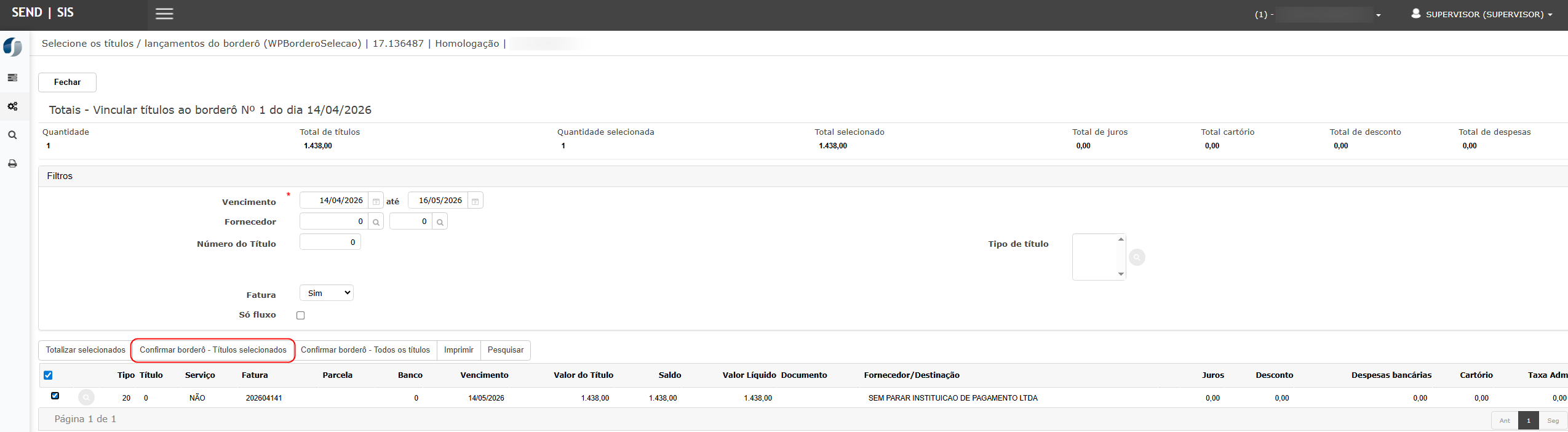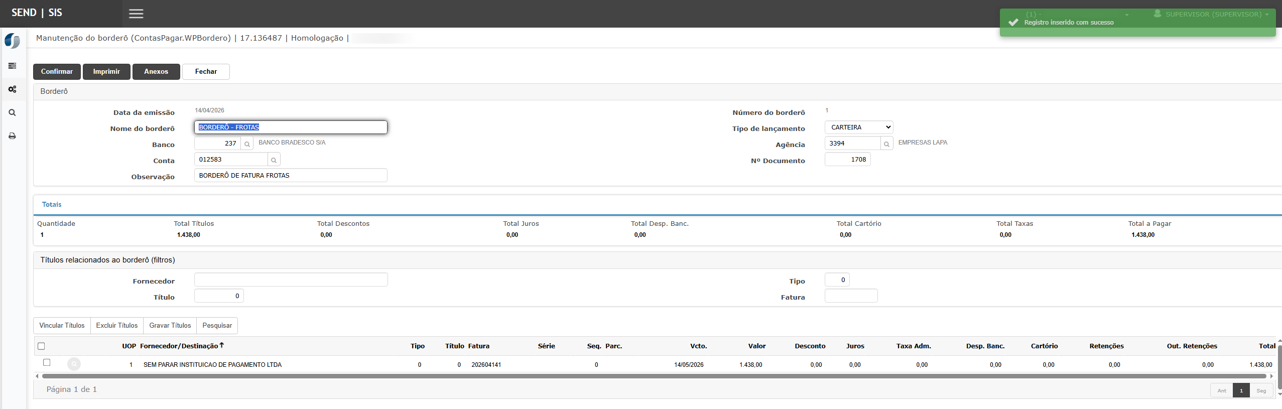 - Ao selecionar o título e confirmar, o vínculo com o borderô deve ser realizado.