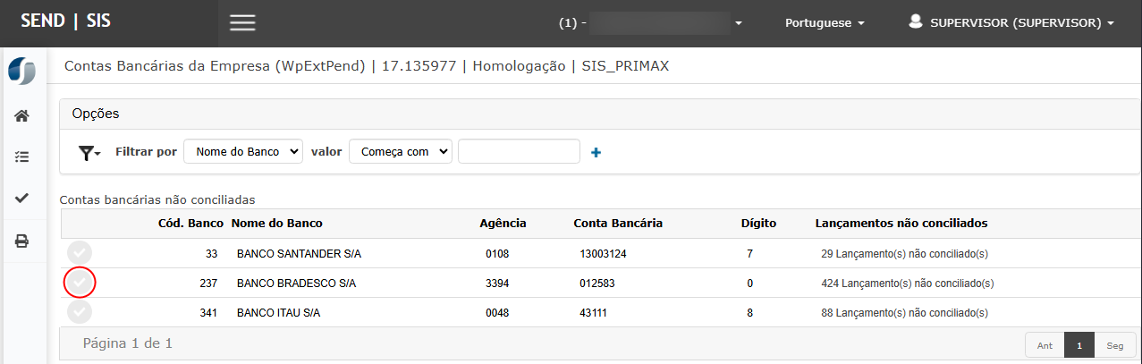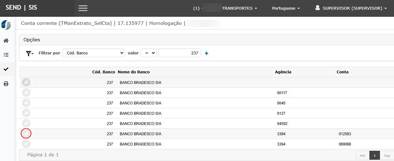 Localize a conta bancária utilizada na baixa do borderô e clique para editar.