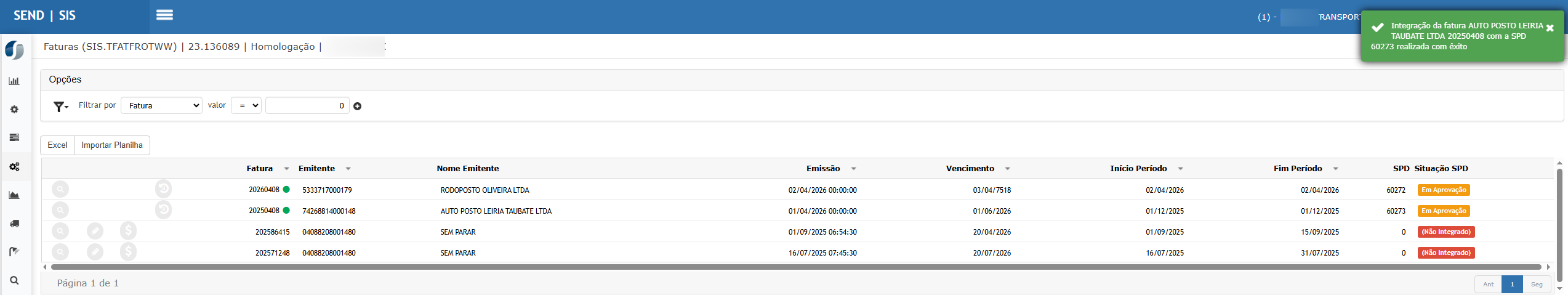 “Integração da fatura SEM PARAR XXXX com a SPD XXXX realizada com êxito” - O histórico do SPD deve ficar disponível para consulta.