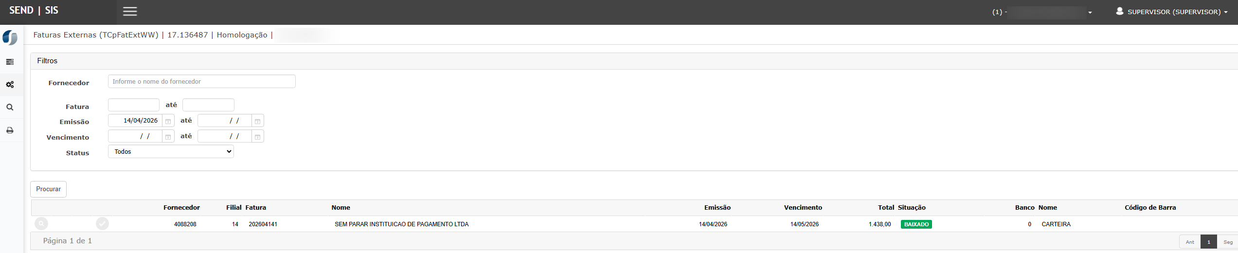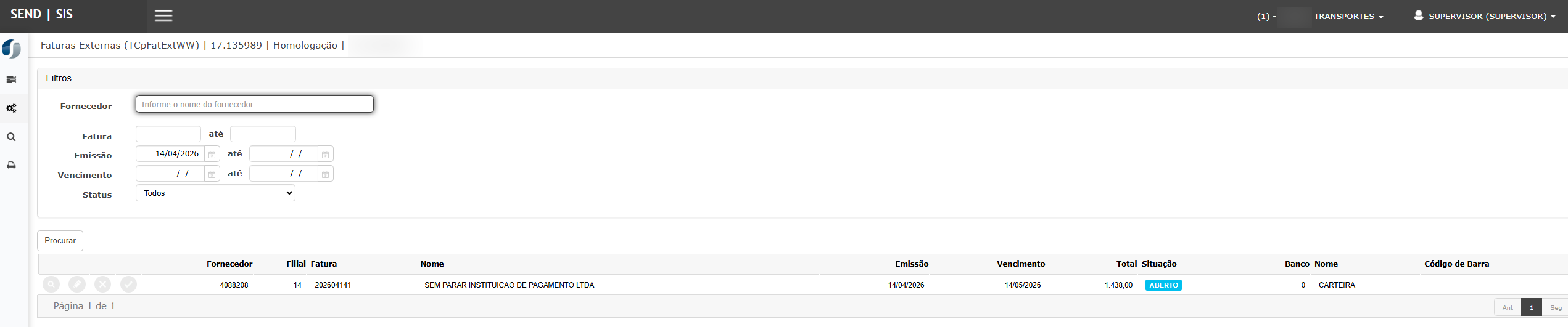 Manutenções > Fatura > Manutenção (Faturas Externas)