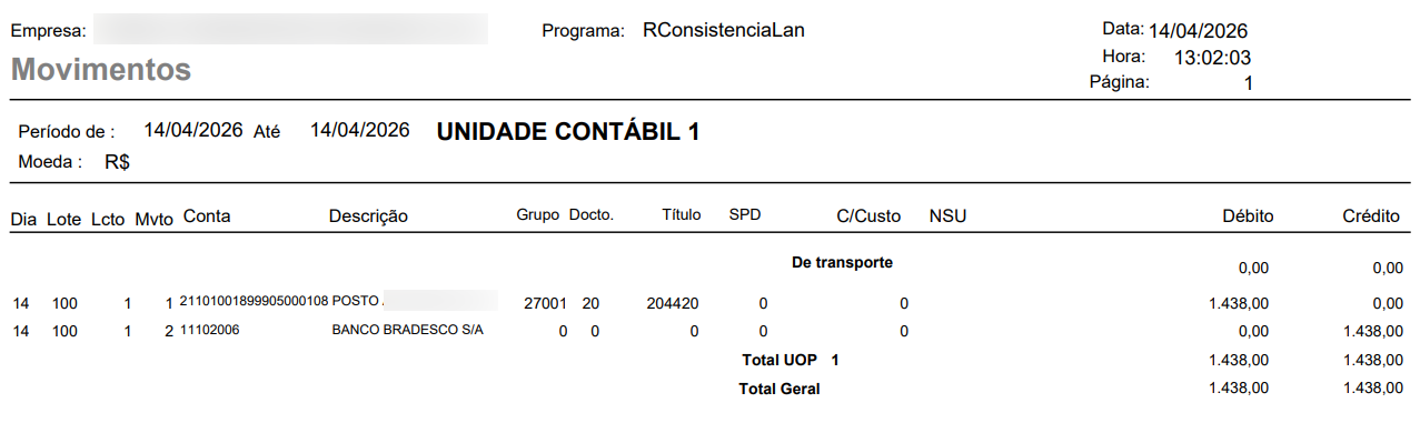 - Os valores de débito e crédito devem estar conciliados corretamente.