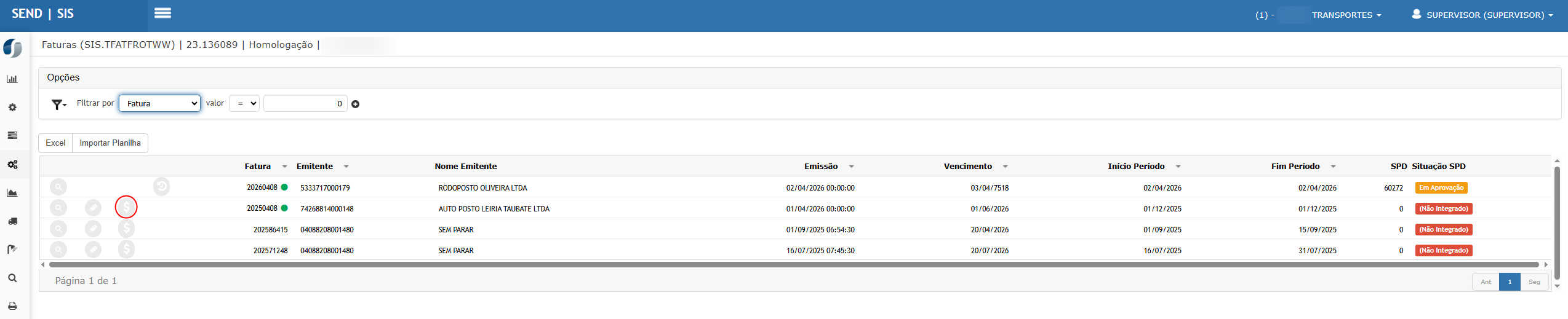 Na tela de consulta/manutenção da fatura do Frotas, clique em Integrar com o SPD.