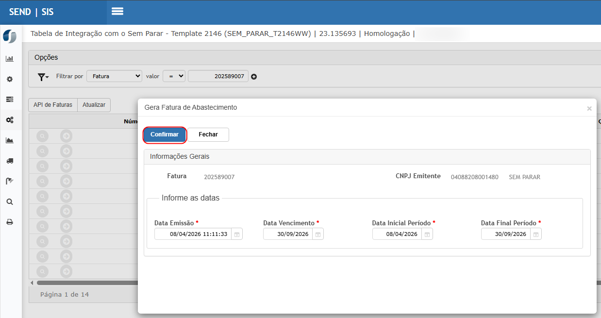- os campos Período Inicial e Período Final são preenchidos conforme os abastecimentos vinculados à fatura Sem Parar;