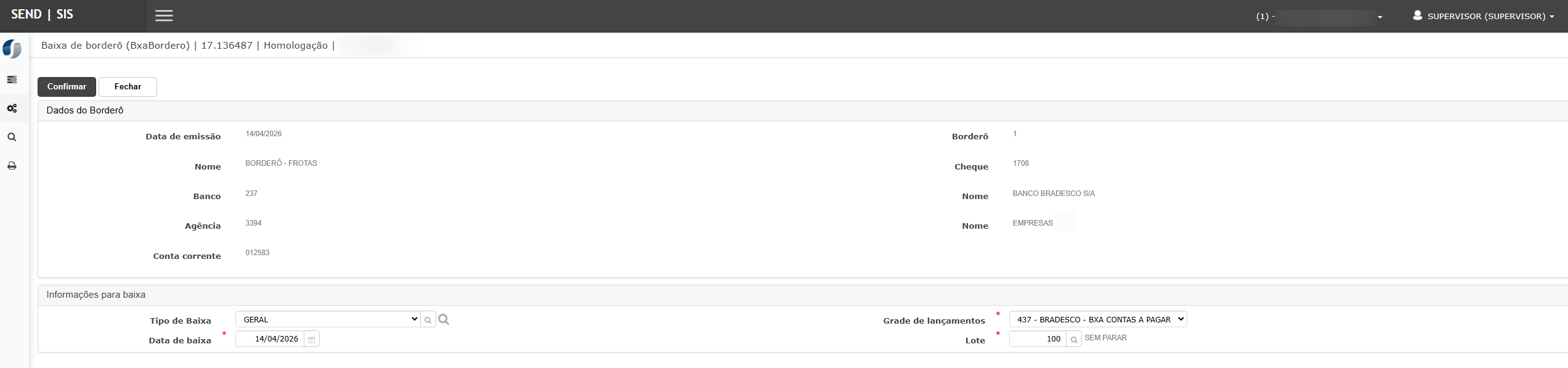 - Os dados da baixa devem demonstrar lote, grade, conta bancária e valor corretamente.