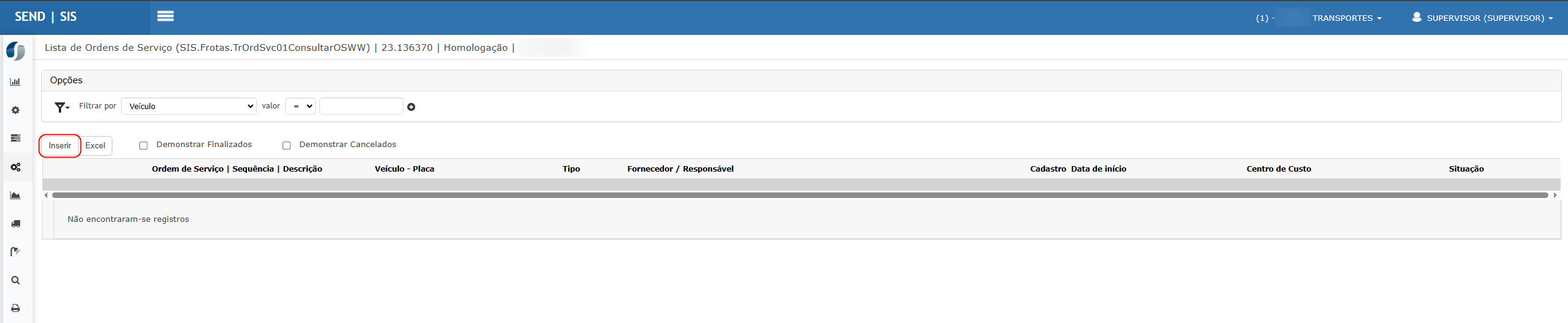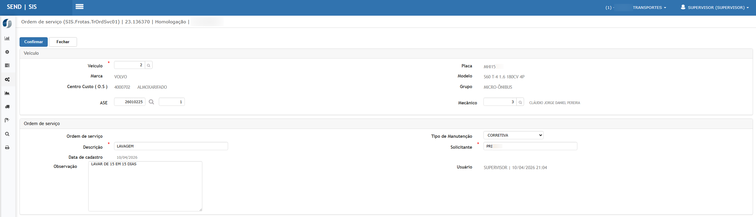 Validar o processo completo de Ordem de Serviço no módulo Gestão de Frotas, incluindo: