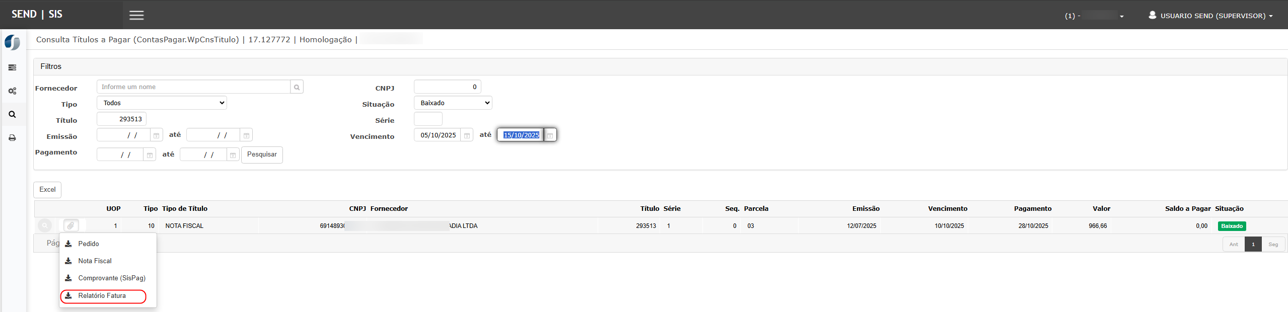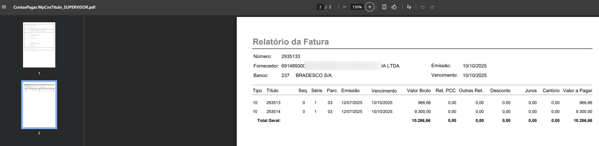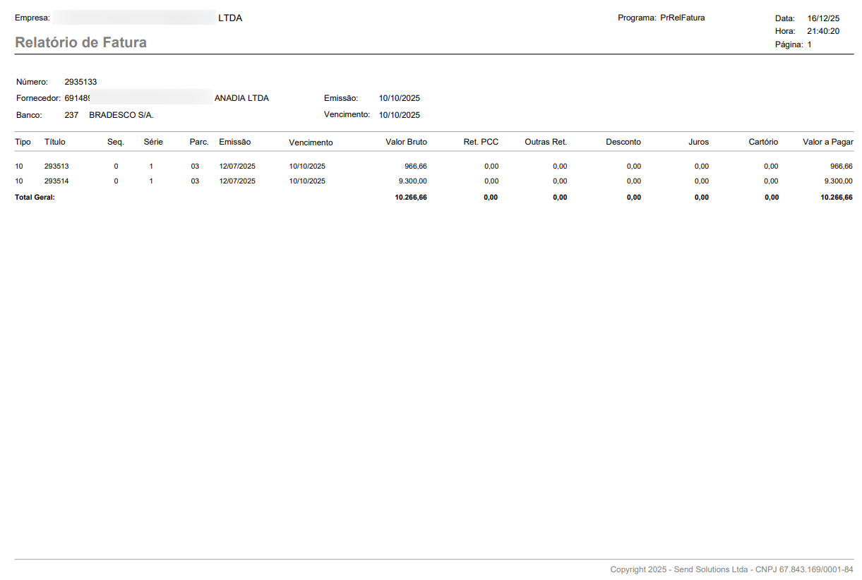 Exista a opção Relatório da Fatura (PrRelFatura) exibindo títulos pagos, valores retidos, juros, multas e descontos.
