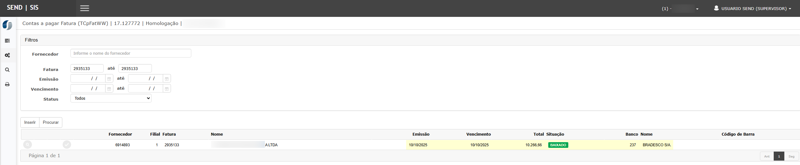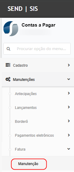 Acessar Contas a Pagar > Manutenções > Faturas > Manutenção.