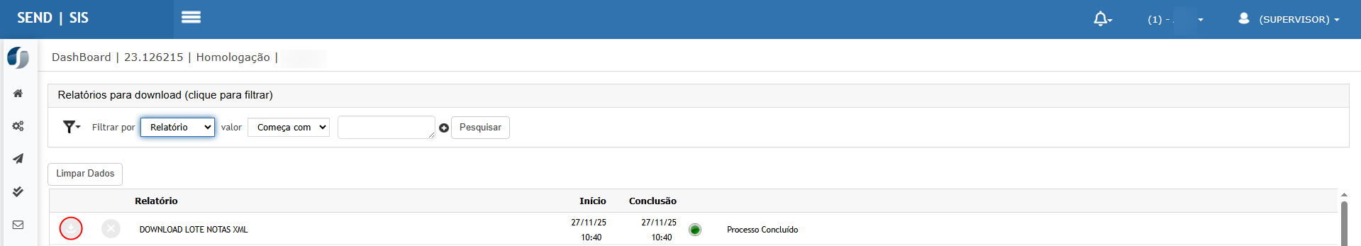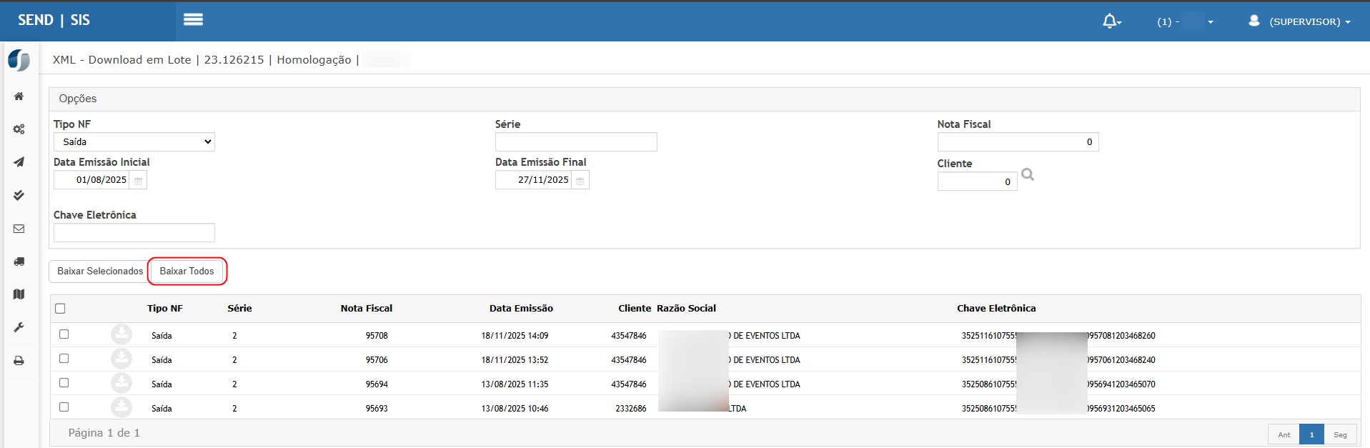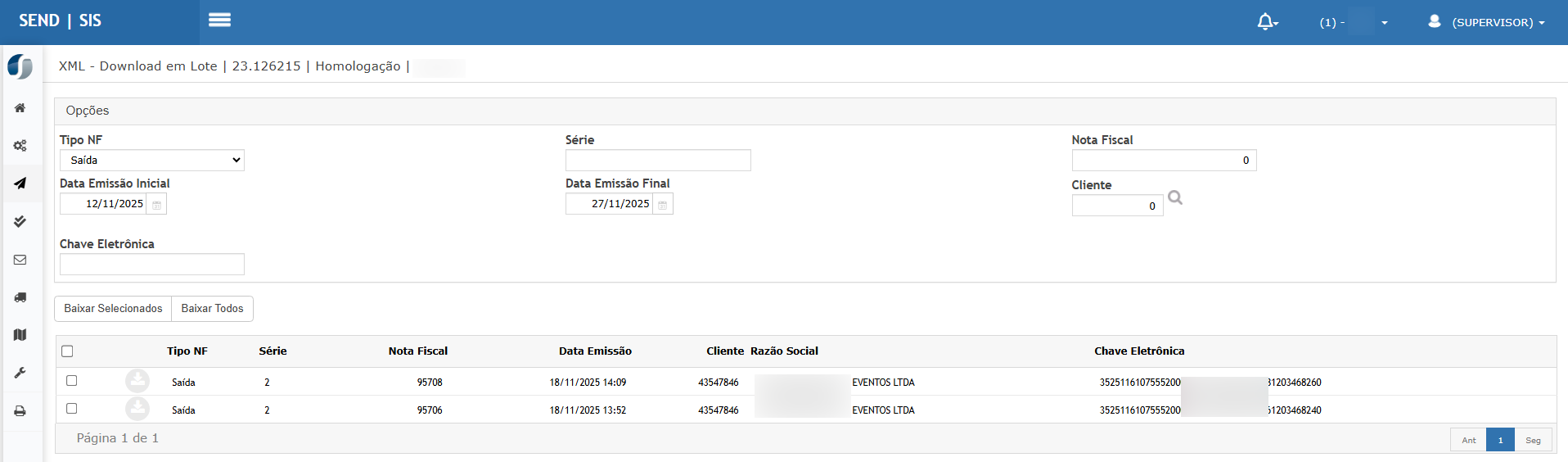 Na tela NFE > Download em Lote, aplicar filtros que retornem um conjunto representativo de NF-e (múltiplas notas).