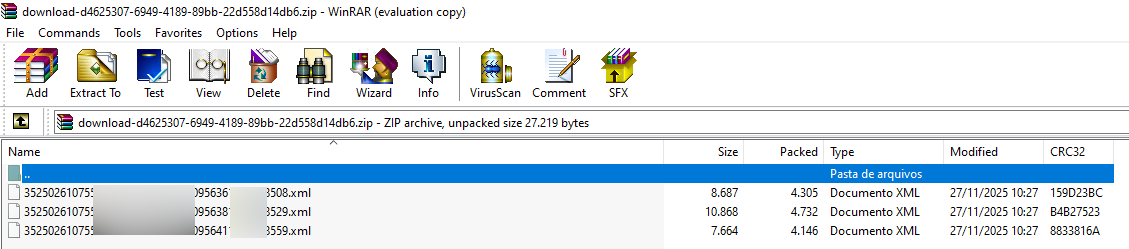 O arquivo ZIP contém apenas os XML dos registros selecionados na página atual.