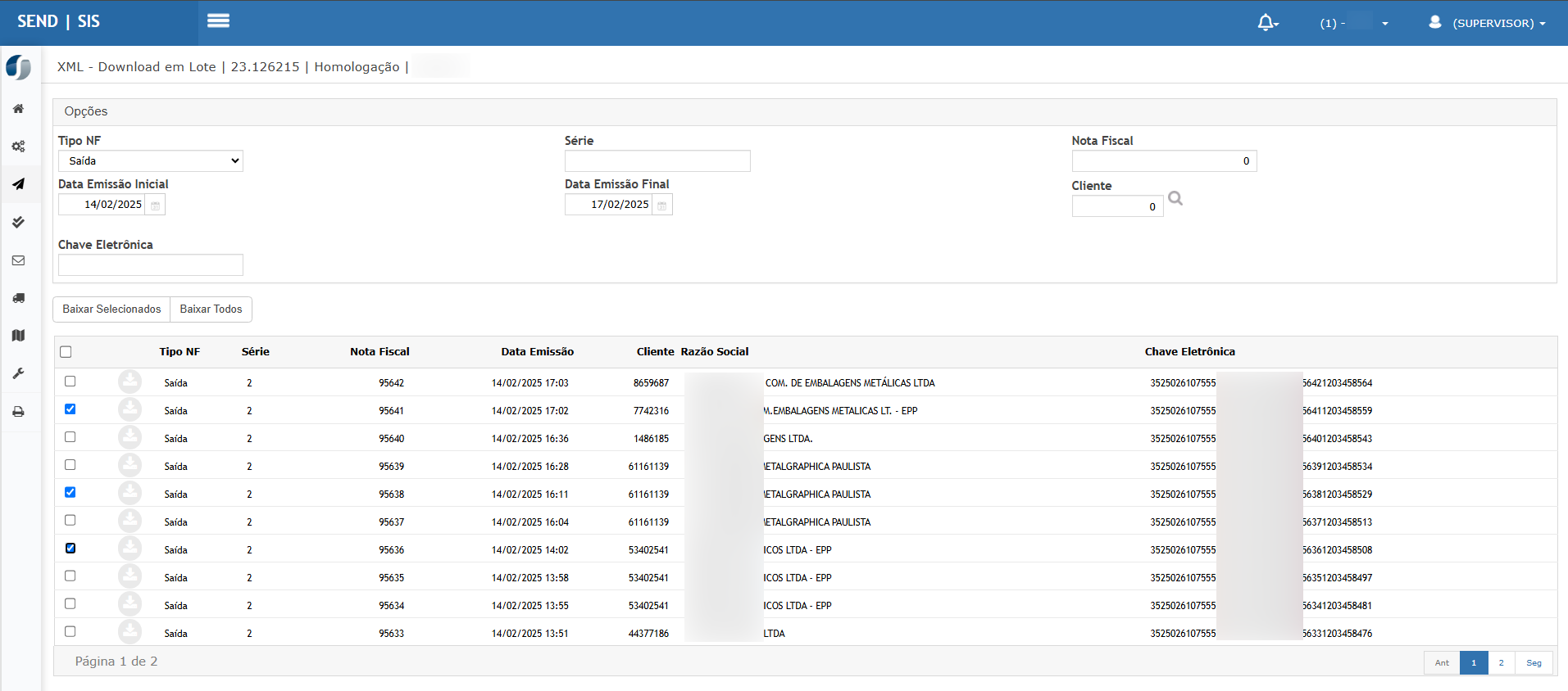 Na tela NFE > Download em Lote, aplicar filtros que retornem mais de uma página de NF-e.
