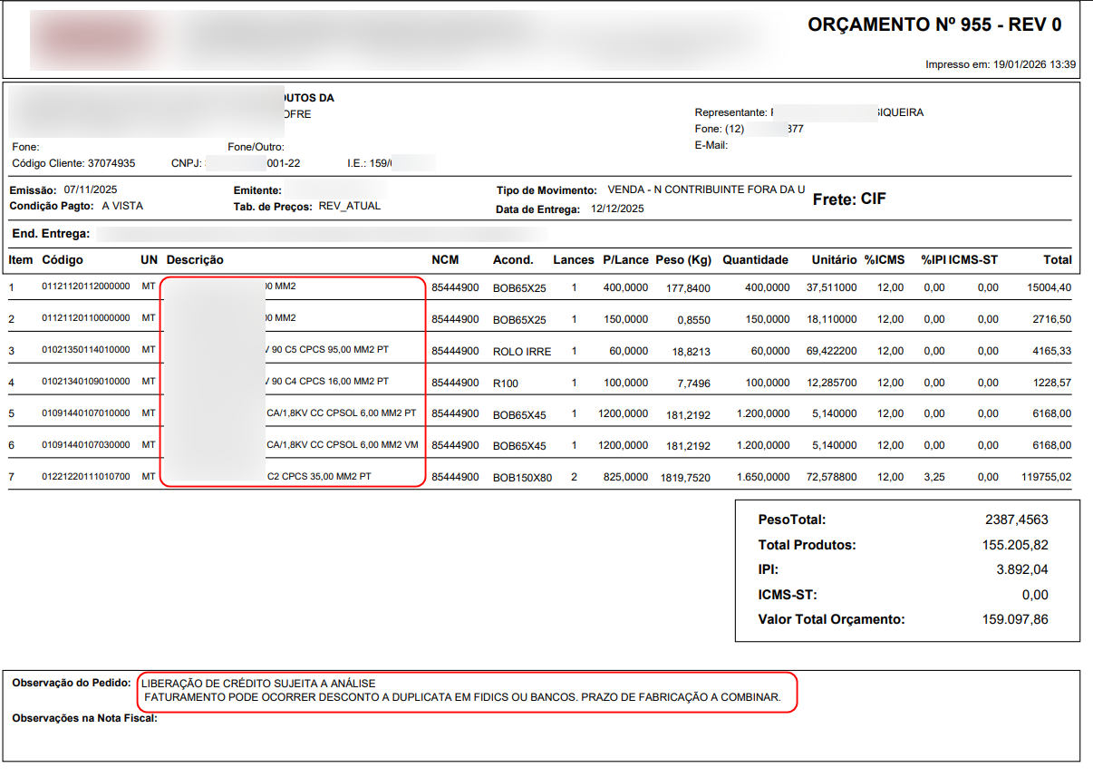 2. Acesse um orçamento/pedido que contenha item com Seção com 2 dígitos e descrição longa.