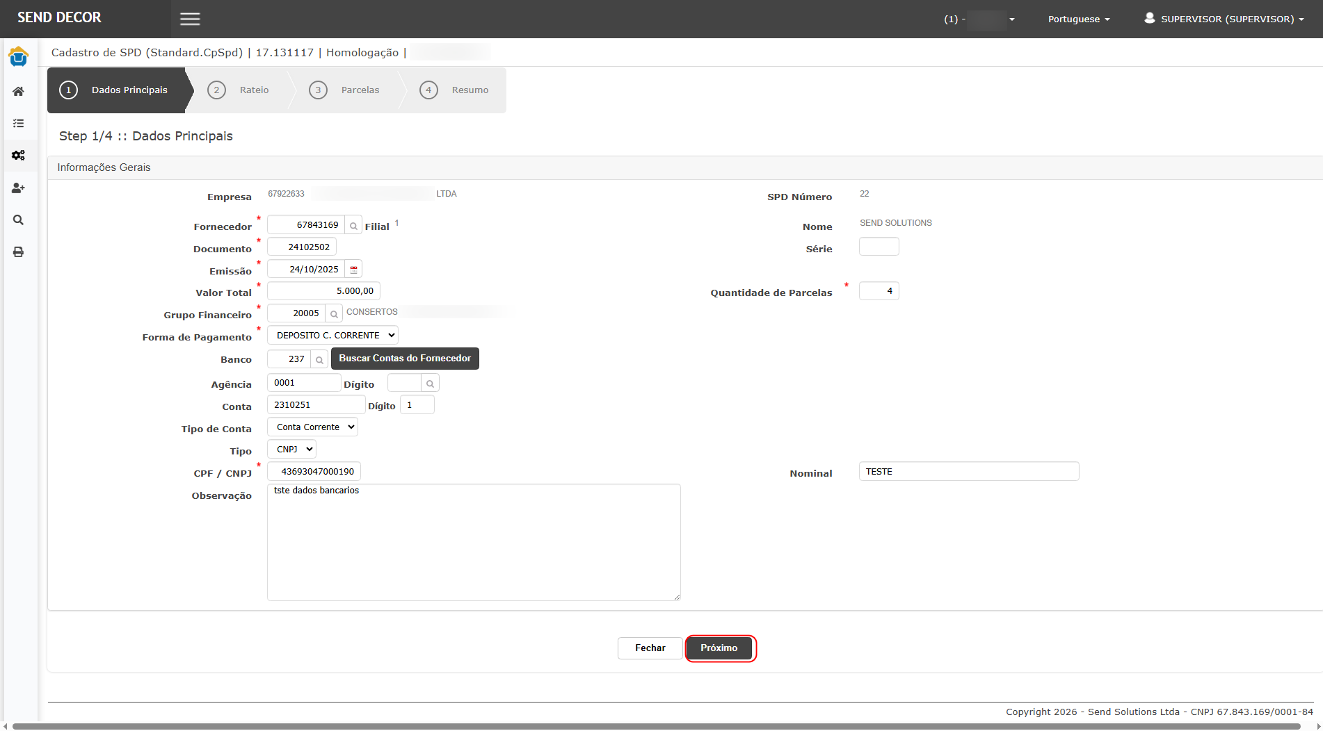 Ao selecionar o fornecedor retornado, o SPD deve prosseguir normalmente para a próxima etapa, sem erro.