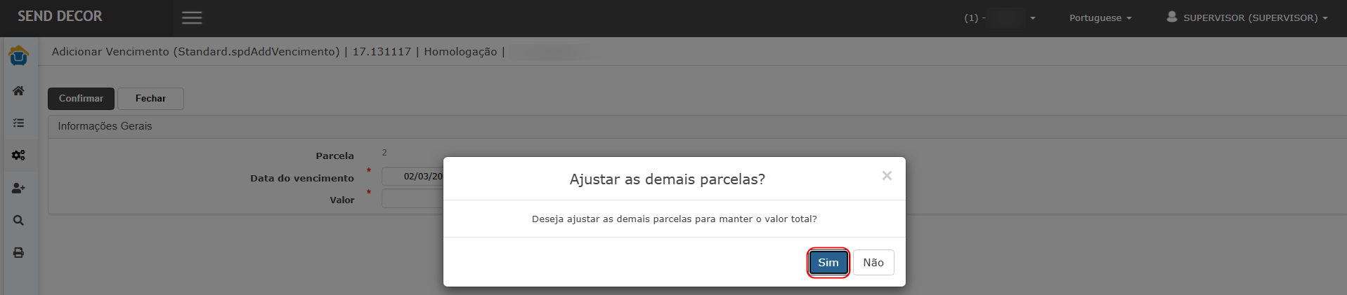Na confirmação “deseja ajustar as demais parcelas?”, clicar em Sim.