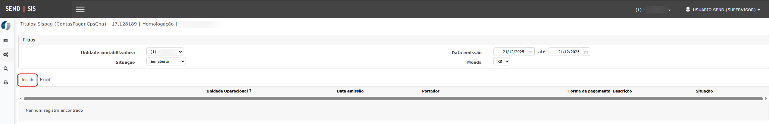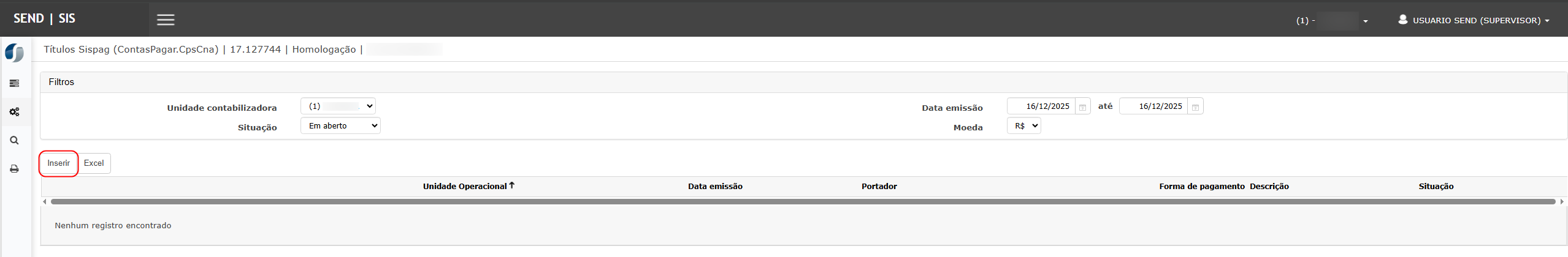 Selecionar a opção de inserir para criar um SISPAG informando que a origem é Fluxo (conforme processo atual).