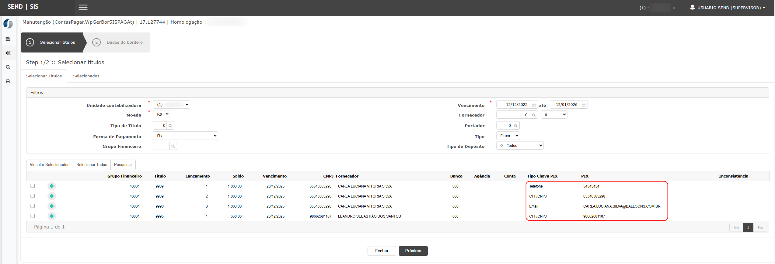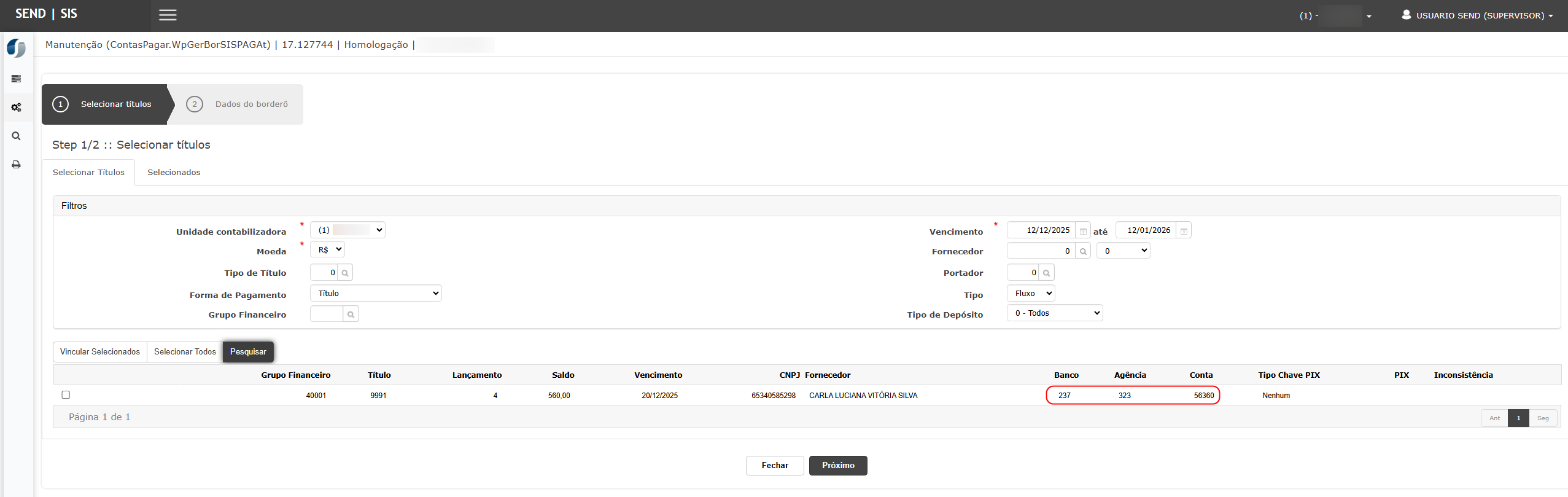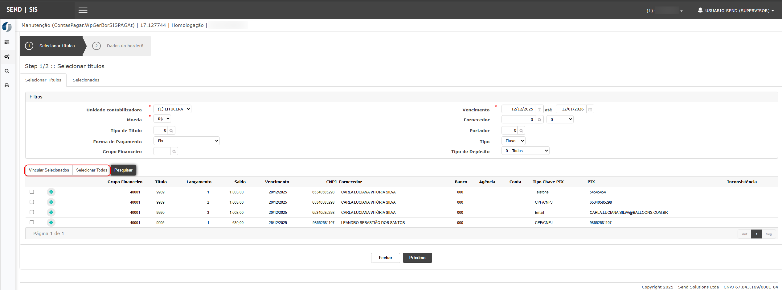 Cenário 02: Criação do SISPAG “com fluxo” deve recuperar dados do lançamento (PIX)