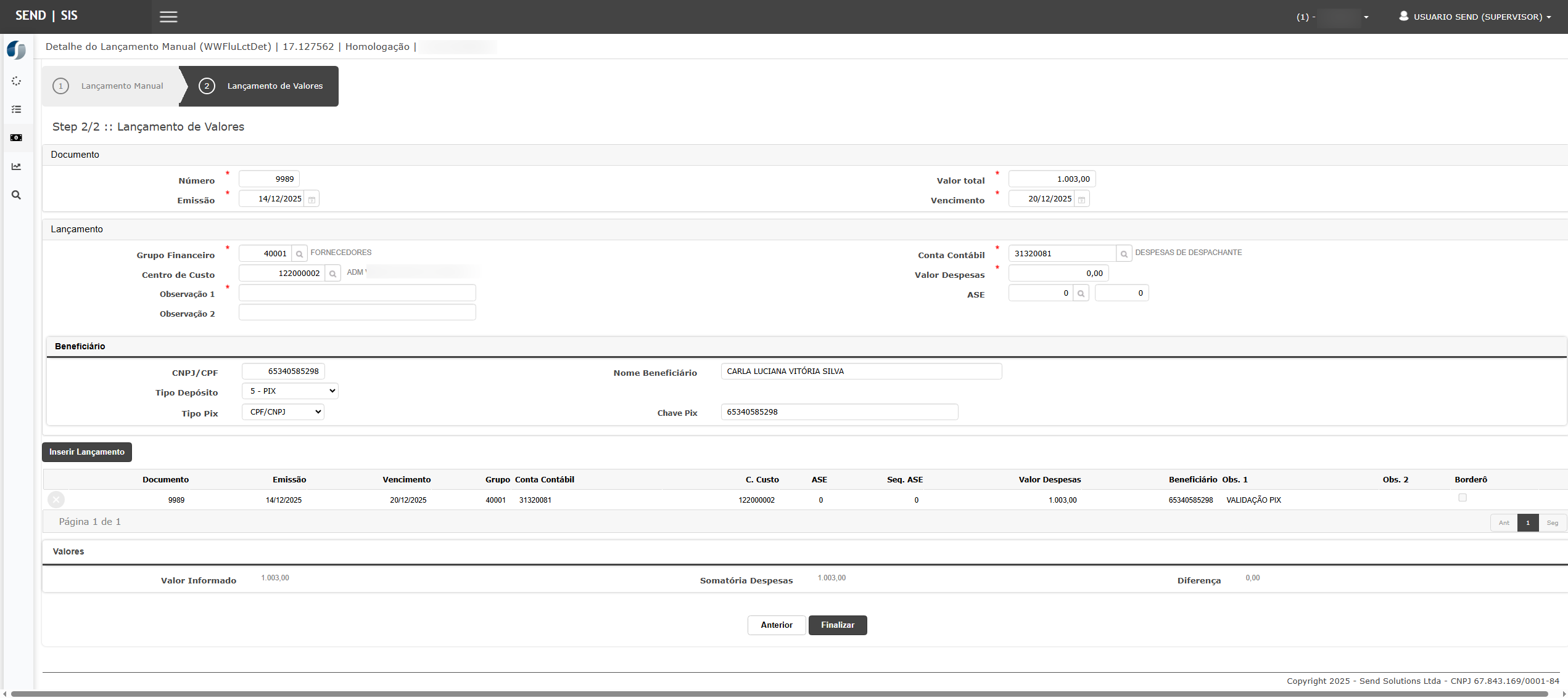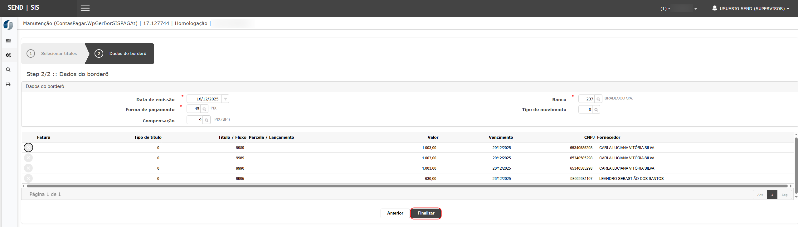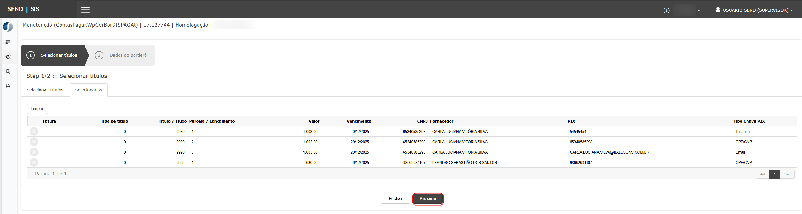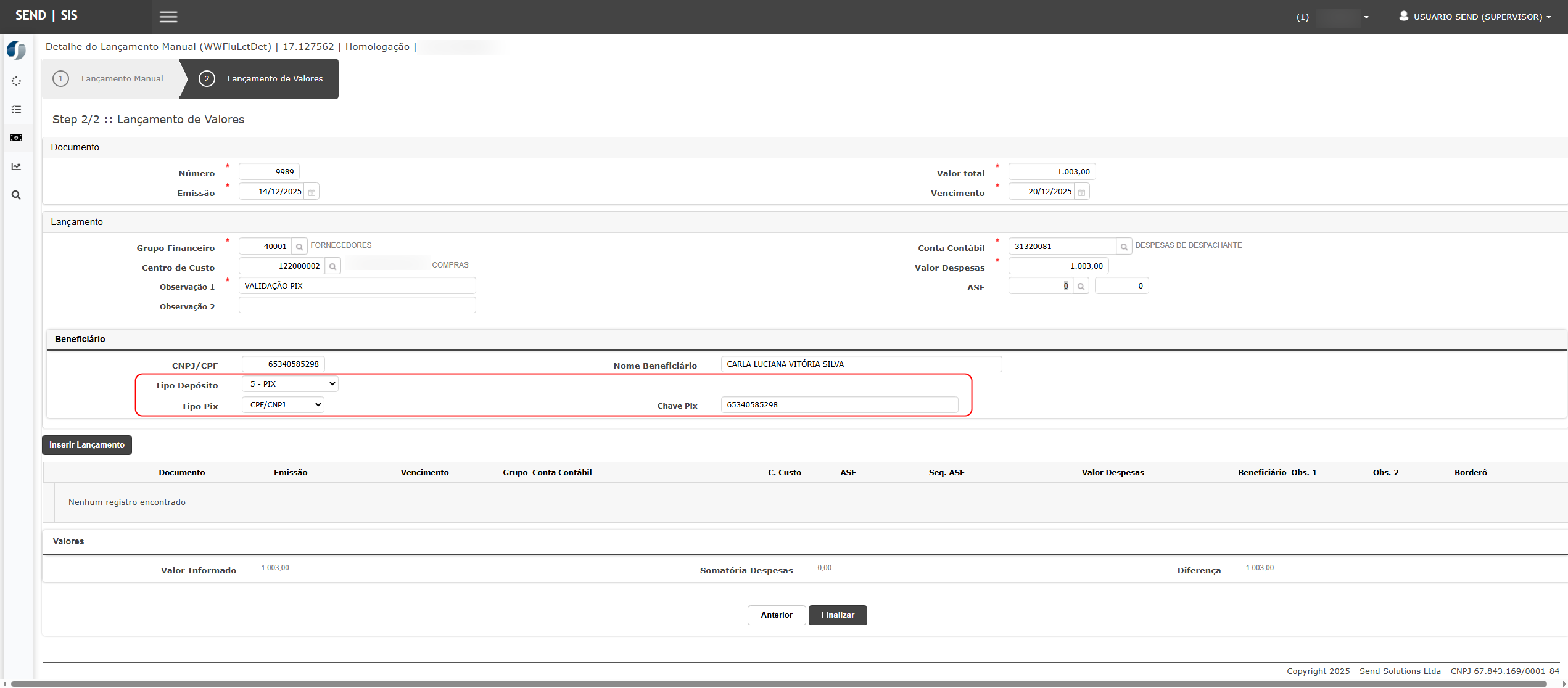 Cenário 02: Criação do SISPAG “com fluxo” deve recuperar dados do lançamento (PIX)