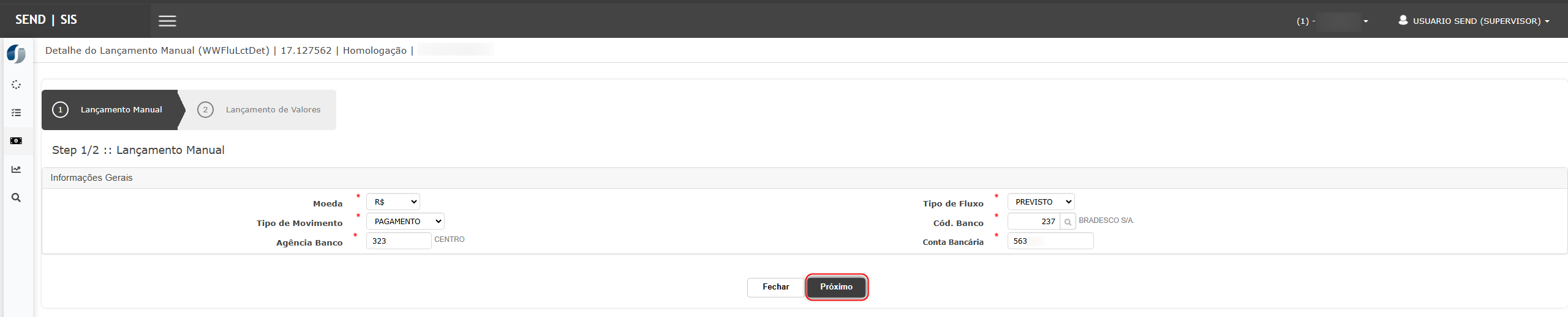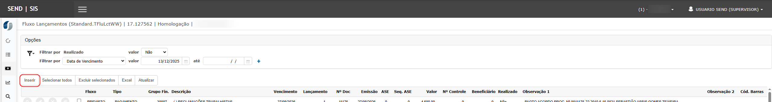 Incluir um novo lançamento do fluxo (ou editar um existente de teste).