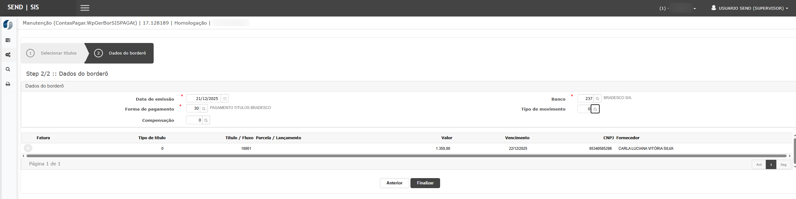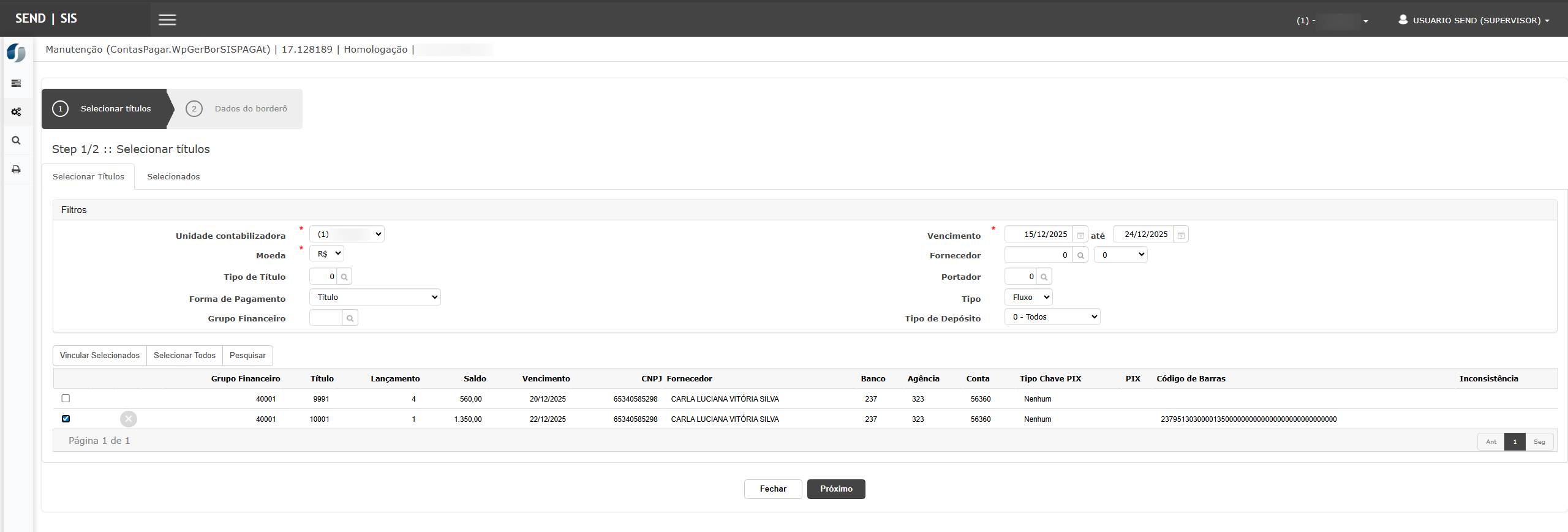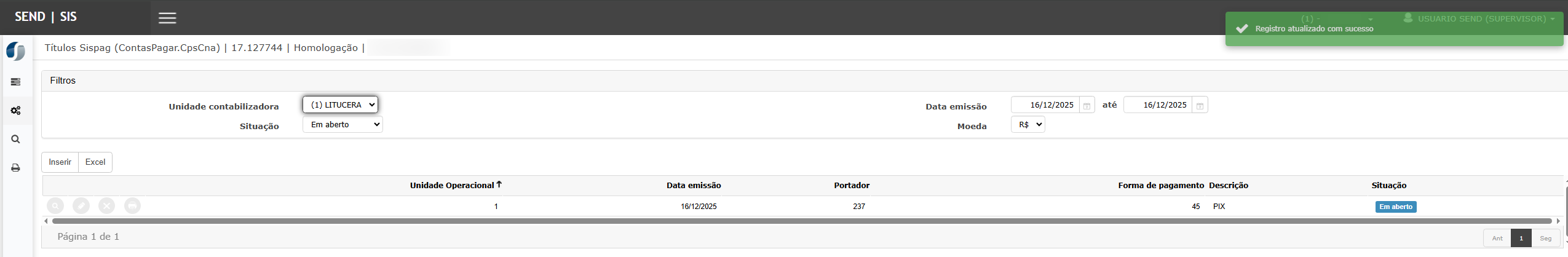 - Montar o SISPAG utilizando a opção de geração no formato de título (conforme regra: para puxar os dados bancários do fluxo).