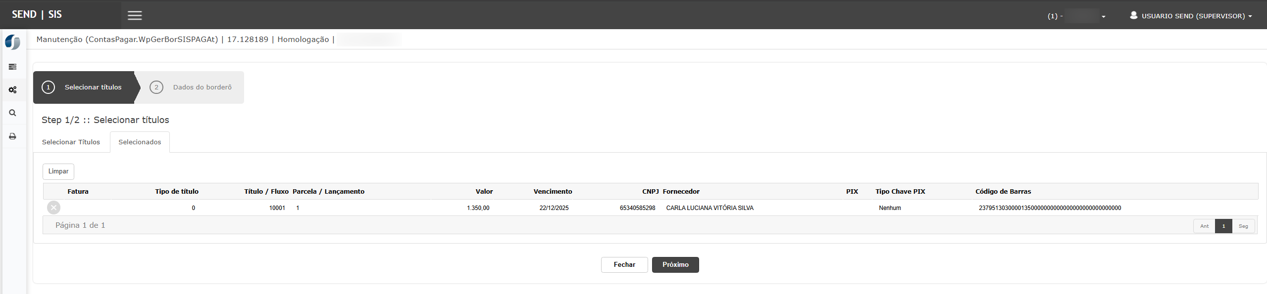 O sistema exibe CNPJ/CPF + Nome do beneficiário.