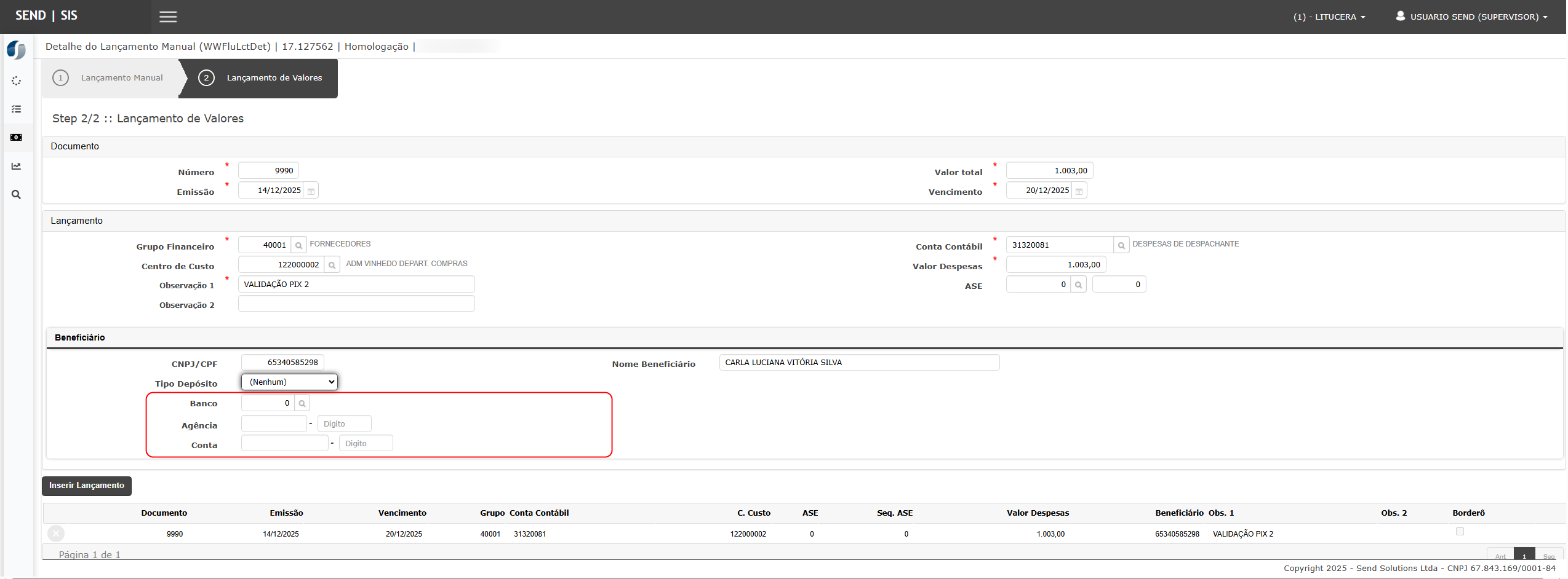 Preencher Banco, Agência e Conta no lançamento (já que não é PIX).