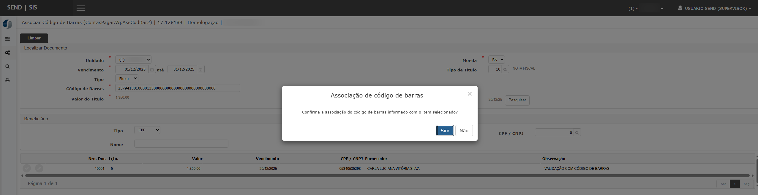 - Informar o código de barras/linha digitável e executar a ação de vincular/associar ao fluxo.