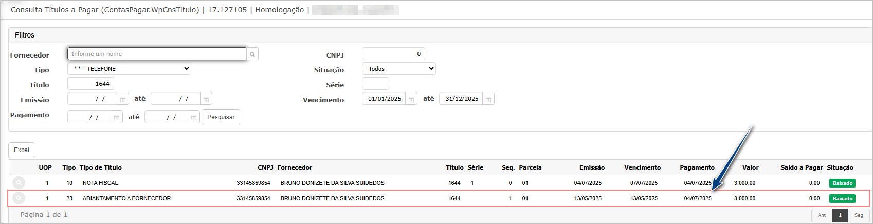 Além disso, foi ajustada a nomenclatura do filtro “Vencimento” para “Data da Baixa”, refletindo corretamente a regra de negócio utilizada na busca dos títulos pagos.