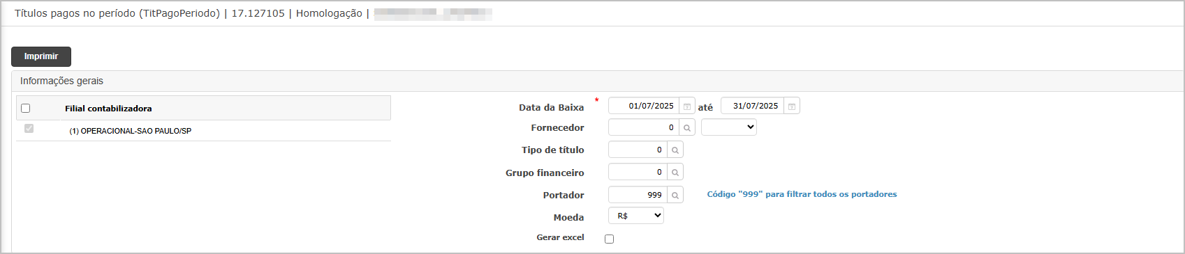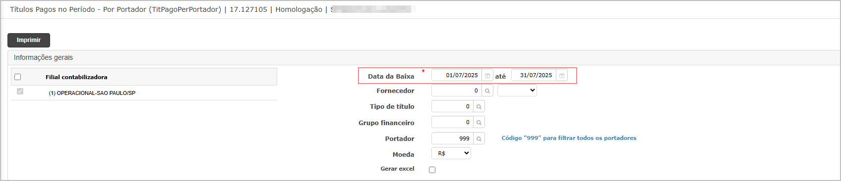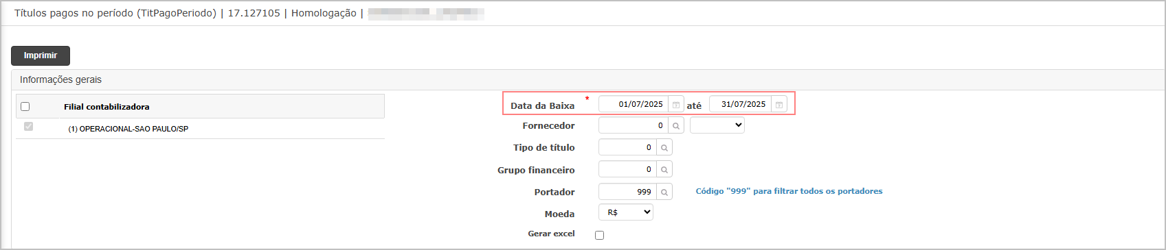 Preencher filtros obrigatórios, incluindo a nova Data da Baixa.